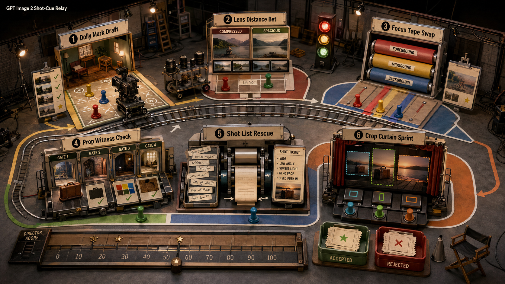 Create one original GPT Image 2 derived-play concept image as a 16:9 landscape scene. Title in the image, small and legible: "GPT Image 2 Shot-Cue Relay". Core format: a continuous playable film-stage relay challenge inside a miniature studio, seen as an isometric cutaway with moving dolly tracks, cue-light towers, focus-puller wheels, stage tape lanes, prop check stations, small projection screens, accepted/rejected shot tickets, and a director-style scoring rail. It must be one integrated playable rehearsal space, not a contact sheet, not a 2x3 grid, not cards, not a dashboard, not an arcade table, not a pinball board, not a circular rules machine, not a greenhouse, not an orchard, and not a tabletop strategy board. Derive the play rules from the Lens Rehearsal Stage use cases. Show six distinct mechanics as labeled physical zones in the same studio relay course: 1 "Dolly Mark Draft" - players choose camera-floor marks before the image is generated; score when the fictional object stays recognizable from each chosen view. 2 "Lens Distance Bet" - players predict whether compressed or spacious scene depth will best match the prompt goal, then compare tiny output strips. 3 "Focus Tape Swap" - colored foreground, midground, and background tapes are rearranged between rounds; bonus if the intended subject remains visually dominant. 4 "Prop Witness Check" - a prop token moves through four scene gates; players pass only when silhouette, color chips, and wear marks remain consistent. 5 "Shot List Rescue" - messy fictional caption scraps travel through cleanup rollers and become a concise shot ticket; penalties for extra clutter. 6 "Crop Curtain Sprint" - square, vertical, and wide curtains close over the projection; players win if the central idea survives every crop. Visual requirements: one coherent studio relay course with all six labels embedded into props or overhead placards, visible tokens in motion, cue lights changing color, small image printouts, score rails, crop curtains, lens carts, floor tape, fabric flats, metal tracks, and paper tickets. Premium editorial 3D illustration, crisp details, varied color palette, warm spotlighting, professional but playful. Text should be sparse: only the title and the six exact labels. No logos, no real brands, no celebrity likenesses, no public figures, no politics, no elections, no political persuasion, no copyrighted characters, no living-artist style imitation, no sexual content, no nudity, no dangerous instructions, no graphic violence, no gore, no watermark.