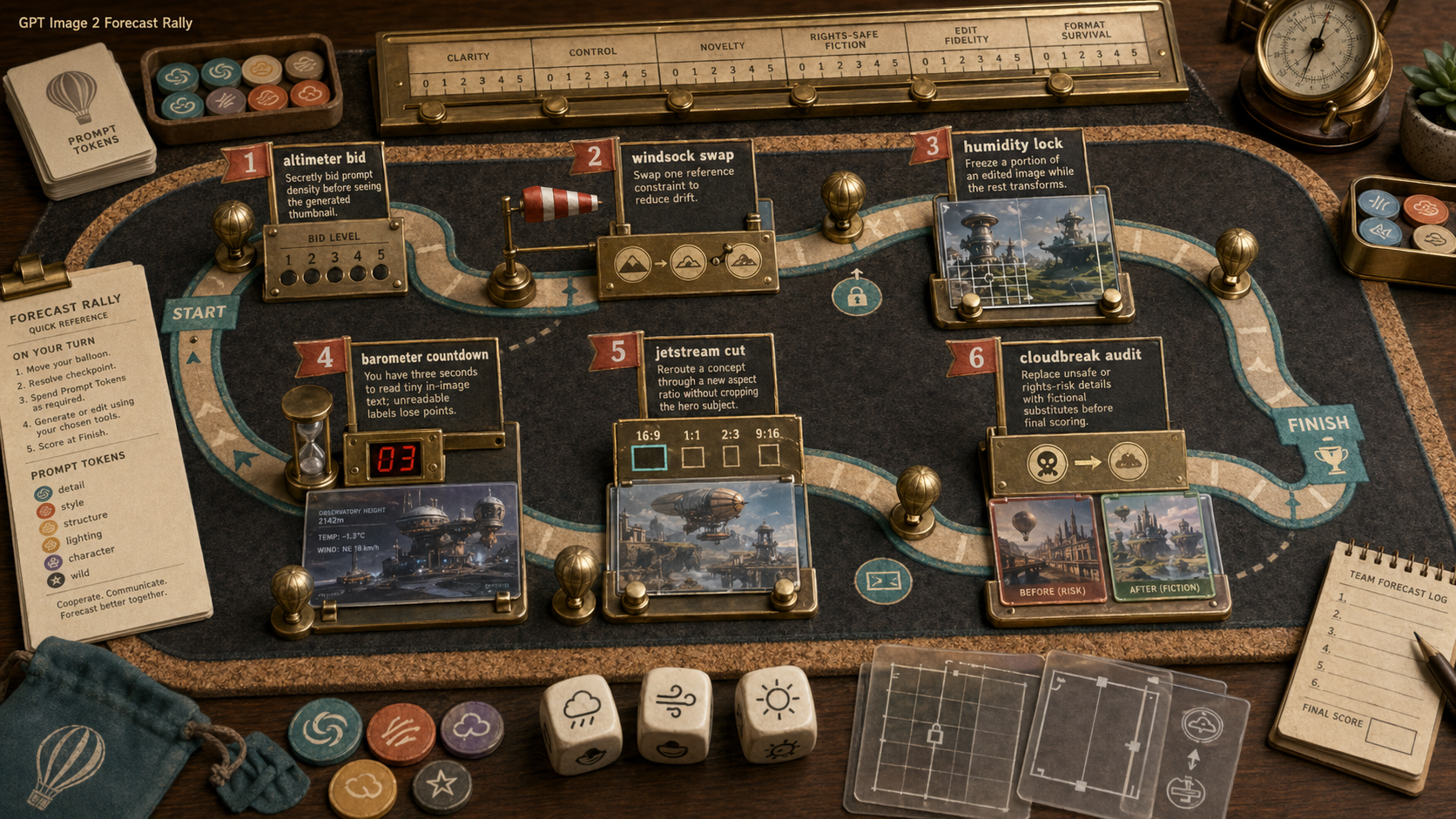 Create one original GPT Image 2 derived-play concept image as a 16:9 landscape scene. Title inside the image, small and legible: "GPT Image 2 Forecast Rally". Core format: a cooperative tabletop weather-rally game derived from the Visual Weather Station idea. This must be a single playable route map across a cork-and-felt table, not a contact sheet, not a 2x3 grid, not separate cards, not a circular rules machine, not pinball, not a film stage, not a greenhouse. Players move tiny brass weather-balloon tokens along a looping forecast route, spending prompt tokens and sliding transparent forecast strips over fictional mini-thumbnails. Six original play mechanics shown as named route checkpoints and physical game components: 1. "altimeter bid" players secretly bid prompt density before seeing the generated thumbnail. 2. "windsock swap" players swap one reference constraint to reduce drift. 3. "humidity lock" players freeze a portion of an edited image while the rest transforms. 4. "barometer countdown" players have three seconds to read tiny in-image text; unreadable labels lose points. 5. "jetstream cut" players reroute a concept through a new aspect ratio without cropping the hero subject. 6. "cloudbreak audit" players replace unsafe or rights-risk details with fictional substitutes before final scoring. Scoring rail: clarity, control, novelty, rights-safe fiction, edit fidelity, format survival. Include small tokens, dice with abstract weather icons, transparent overlays, a brass score counter, miniature balloons, and a printed rule slip. All names, sample products, places, and thumbnails are fictional. Visual language: sophisticated tabletop product photography plus whimsical engineering props; cork, dark felt, brass, vellum overlays, teal route lines, vermilion checkpoint flags, ivory cards. Clear readable short labels. Avoid real brands. Avoid trademarks. Avoid celebrities. Avoid public figures. Avoid copyrighted characters. Avoid political persuasion. Avoid elections. Avoid party symbols. Avoid harmful instructions. Avoid sexual content. Avoid nude content. Avoid explicit content. Avoid graphic violence. Avoid gore. Avoid blood. Avoid weapons. Avoid watermarks. Composition: low oblique tabletop view with the looping route crossing the image diagonally; six checkpoint devices are part of one continuous board game, not boxed panels. The image should feel like a complete playable artifact someone could pick up and use.