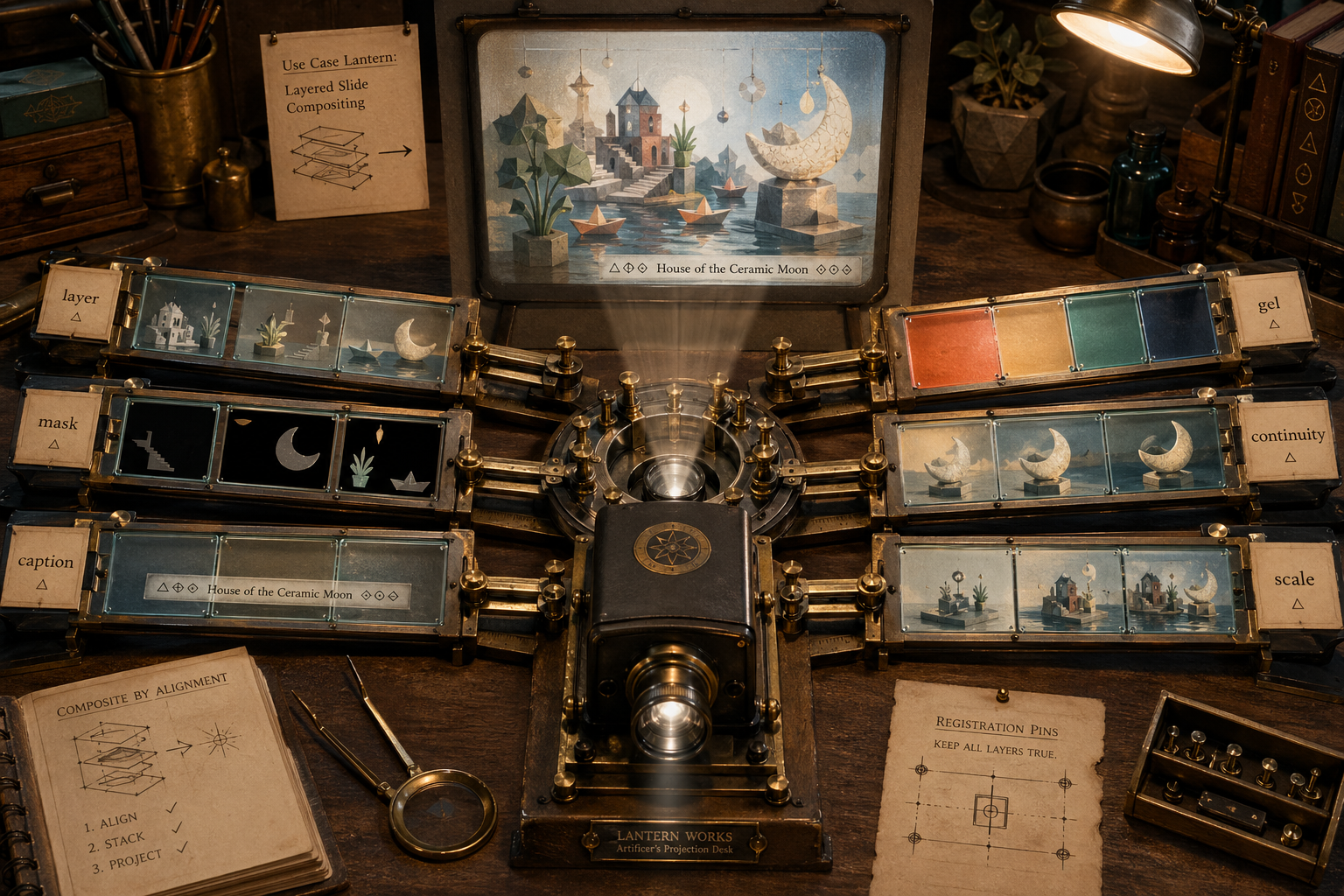 Use case: productivity-visual / infographic-diagram Asset type: original GPT Image 2 use-case exploration image, landscape 16:9 Primary request: Create a single high-resolution visual concept titled "Use Case Lantern: Layered Slide Compositing" as an analog magic-lantern projection desk, not a 2x3 board and not a card spread. Show a fictional tabletop projector casting one composite image onto a small screen while six physical glass slide strips sit in rails around it. Each strip represents a distinct GPT Image 2 use case: (1) layer-separation prompt: foreground, midground, background as separate translucent slides; (2) blackout-mask prompt: negative constraints drawn as opaque cutout masks; (3) caption-register prompt: a tiny fictional label slide aligned with the image; (4) color-gel prompt: mood and palette controlled by removable gel filters; (5) continuity-stack prompt: same fictional object preserved across three slide passes; (6) scale-shift prompt: miniature/model view and full-scene view aligned by registration pins. Scene/backdrop: warm workshop table with a compact fictional magic-lantern projector, glass-slide rails, registration pins, vellum notes, and projected composite image on a small matte screen. Subject: the six use cases are visible as physical slide mechanisms and projected results, using invented objects only: abstract houses, ceramic moons, paper boats, geometric plants, and fictional symbols. Style/medium: detailed editorial illustration with realistic materials, translucent glass, brass rails, matte paper, crisp tiny UI-like annotations. Composition/framing: three-quarter overhead view; continuous tabletop apparatus with radial slide rails converging toward the projector; the projected image is a layered, readable composite. The layout must feel like a usable optical instrument, not six rectangular panels. Lighting/mood: warm lamp light, soft projector beam, high clarity, no smoky haze obscuring details. Color palette: amber brass, teal glass edges, ivory paper, muted coral and cobalt gel filters, balanced and not dominated by a single hue. Text (verbatim, small labels only): "layer", "mask", "caption", "gel", "continuity", "scale". Constraints: original concept; all brands, institutions, characters, data, labels, and objects must be fictional; make the mechanism legible through physical stacking and projection; avoid a 2x3 grid, contact sheet, station board, loom, weather station, printshop, planetarium, film stage, pinball table, greenhouse, airport terminal, or laundromat. Avoid: disallowed sensitive, unsafe, adult, graphic, real-world identity, brand, rights-restricted, living-artist-style, and watermark material.