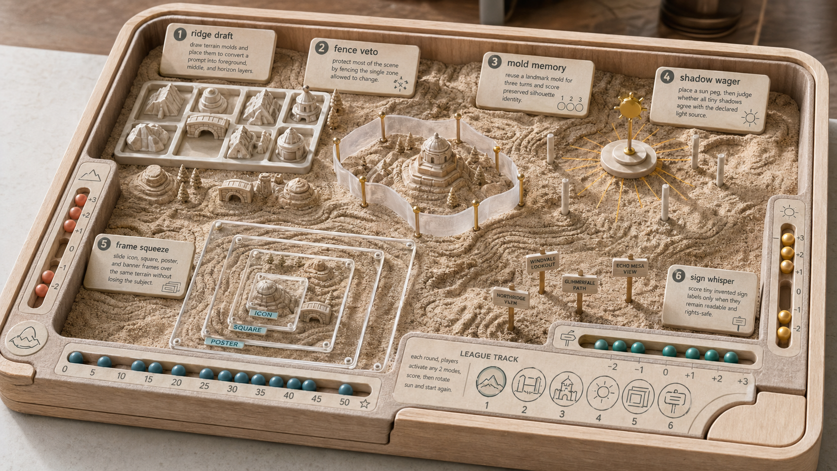 Create a wide 16:9 original derived-play concept scene titled "Derived Play: Contour Sandbox League". Purpose: derive a playable image-prompt game from the sand-table use-case idea, but make it a distinct rules object: a competitive kinetic-sand terrain arena with molded pieces, survey gates, scoring beads, change-boundary fences, light pegs, and crop frames. Do not make a 2x3 board, card spread, poster, patchbay, projector, planetarium, loom, printshop, weather station, film stage, pinball table, route-map board game, glass-slide apparatus, or arcade cabinet. Scene format: close diagonal view of a shallow wooden sandbox arena on a clean studio table. Players are absent. The arena contains sculpted dunes and ridges, removable molds, vellum fences, brass pins, transparent crop frames, shadow sticks, tiny fictional sign stakes, score channels, and colored beads. All labels, symbols, places, objects, and organizations are fictional or absent. Six derived play modes should be visible as mechanisms on the same terrain arena, each with a short readable label: 1. "ridge draft" - draw terrain molds and place them to convert a prompt into foreground, middle, and horizon layers. 2. "fence veto" - protect most of the scene by fencing the single zone allowed to change. 3. "mold memory" - reuse a landmark mold for three turns and score preserved silhouette identity. 4. "shadow wager" - place a sun peg, then judge whether all tiny shadows agree with the declared light source. 5. "frame squeeze" - slide icon, square, poster, and banner frames over the same terrain without losing the subject. 6. "sign whisper" - score tiny invented sign labels only when they remain readable and rights-safe. Visual language: tactile premium tabletop prototype, kinetic sand, thin birch walls, matte ceramic molds, translucent survey frames, brass sun pegs, teal/coral/yellow scoring beads, crisp engraved icons, playful but calm. It should read as a real playable sand-sculpting rule system, not a diagram or ordinary board game. Composition: the sandbox arena fills the frame from lower left to upper right; the six mechanisms are connected by sand ridges and bead score tracks. Use shallow depth of field only lightly so the components remain legible. Safety and originality constraints: original concept and prompt; no external prompt, article, image, artwork, repository, or case-study source reused; all entities, marks, characters, places, labels, and institutions are fictional or rights-safe; keep the content non-political, non-adult, non-graphic, non-harmful, and free of real brands, celebrities, copyrighted characters, living-artist style imitation, and watermarks. Avoid showing: underwater sonar, bathymetry screens, portholes, signal patch cables, oscilloscope panels, transparent slide projectors, celestial star maps, hanging mobiles, printing presses, weaving looms, weather gauges, film sets, arcade cabinets, tabletop card layouts, six rectangular panels, route-map game boards, and pinball scoring tables.