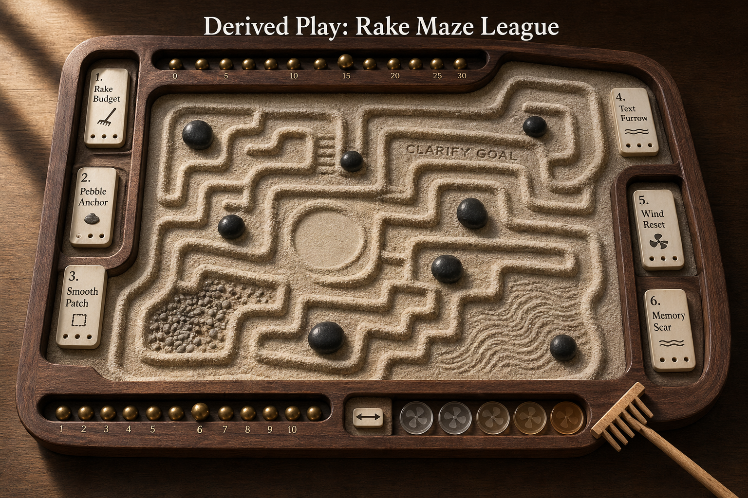 Create a second polished gallery image that derives a playable original mechanic from the previous sand-tray use case. Title text visible: "Derived Play: Rake Maze League" Output format: one tabletop sand-tray game seen from above, shaped like an asymmetrical raked labyrinth with scoring beads and rule tokens around the rim. It must not be a 2x3 research board, not a card spread, not a machine console, not a pinball table, not a route map, and not a circular rules machine. Make it a cohesive physical play surface where the rules are embodied in sand, stones, and small tags. Visible rule labels, clean and legible, exactly these short labels: 1. "Rake Budget" 2. "Pebble Anchor" 3. "Smooth Patch" 4. "Text Furrow" 5. "Wind Reset" 6. "Memory Scar" Gameplay mechanics: - Rake Budget: players spend limited rake strokes to turn a messy prompt into a clear visual path. - Pebble Anchor: anchor stones lock important subject constraints in place. - Smooth Patch: a local edit zone can be cleared and redrawn once without disturbing adjacent grooves. - Text Furrow: a short carved label must remain readable after crossing the maze. - Wind Reset: a translucent fan token partially erases weak paths and forces a new prompt strategy. - Memory Scar: faint old grooves count as reusable context if they still align with the goal. Visual style: refined overhead editorial photography, tactile sand detail, shallow walnut tray, black pebbles, brass score beads, tiny ivory rule tags, one small wooden rake resting at the edge, soft angled sunlight, crisp shadows, professional gallery image. No humans, no real logos, no famous characters, no living-artist style imitation, no politics, no violence, no sexual content, no dangerous instructions, no watermark.