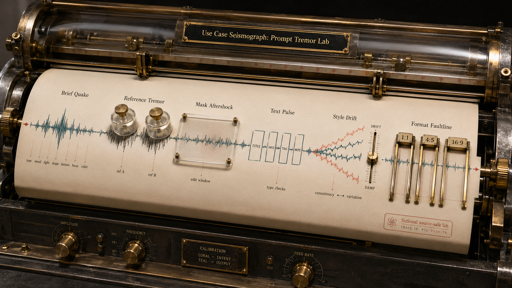 Create a single polished gallery image for an original GPT Image 2 use-case concept. Title text visible, small and legible: "Use Case Seismograph: Prompt Tremor Lab" Output format: one continuous analog seismograph paper-roll artifact, landscape 16:9, photographed from a low three-quarter angle. A long cream strip of graph paper feeds through a fictional brass-and-glass seismograph recorder from left to right. The whole image is one unbroken paper trace, not a grid, not a 2x3 board, not separate panels, not cards, not a tabletop game, not a lab rack, not a receipt, not a mosaic, not a sand tray, not a loom, not a camera stage, not an aquarium, not a patchbay. Visible short labels printed directly along the paper tape, in sequence: "Brief Quake" -> "Reference Tremor" -> "Mask Aftershock" -> "Text Pulse" -> "Style Drift" -> "Format Faultline" Use-case mechanisms shown on the same continuous trace: - Brief Quake: a clean initial waveform with tiny prompt keywords encoded as abstract ticks, showing how a short brief becomes a strong visual direction. - Reference Tremor: two transparent calibration weights press near the trace, showing fictional reference-image influence without depicting any real person, logo, brand, or copyrighted character. - Mask Aftershock: a small removable translucent edit window overlays one section of the trace, with controlled ripple marks showing localized image edits. - Text Pulse: several enlarged square-wave beats carry tiny fictional labels, showing short text rendering checks. - Style Drift: twin colored traces slowly diverge and then are corrected by a damping slider, showing consistency and variation control. - Format Faultline: the final strip passes through three paper-width gates labeled "1:1", "4:5", and "16:9", showing aspect ratio planning without making separate panels. Design details: elegant fictional instrument, no real brands, no people, no famous characters, no political content, no dangerous instructions, no sexual or graphic content. Use restrained colors with brass, graphite, teal ink, coral calibration marks, and warm paper. Include tiny provenance stamp reading "fictional source-safe lab". Ensure text is legible but secondary to the artifact. High detail, editorial product-photography quality, soft shadows, crisp readable labels.