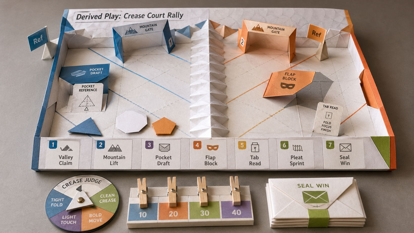 从折纸语法图派生出的纸面赛道玩法:Valley Claim、Mountain Lift、Pocket Draft、Flap Block、Tab Read、Pleat Sprint 和 Seal Win 把提示折痕变成一局可玩的策略赛。