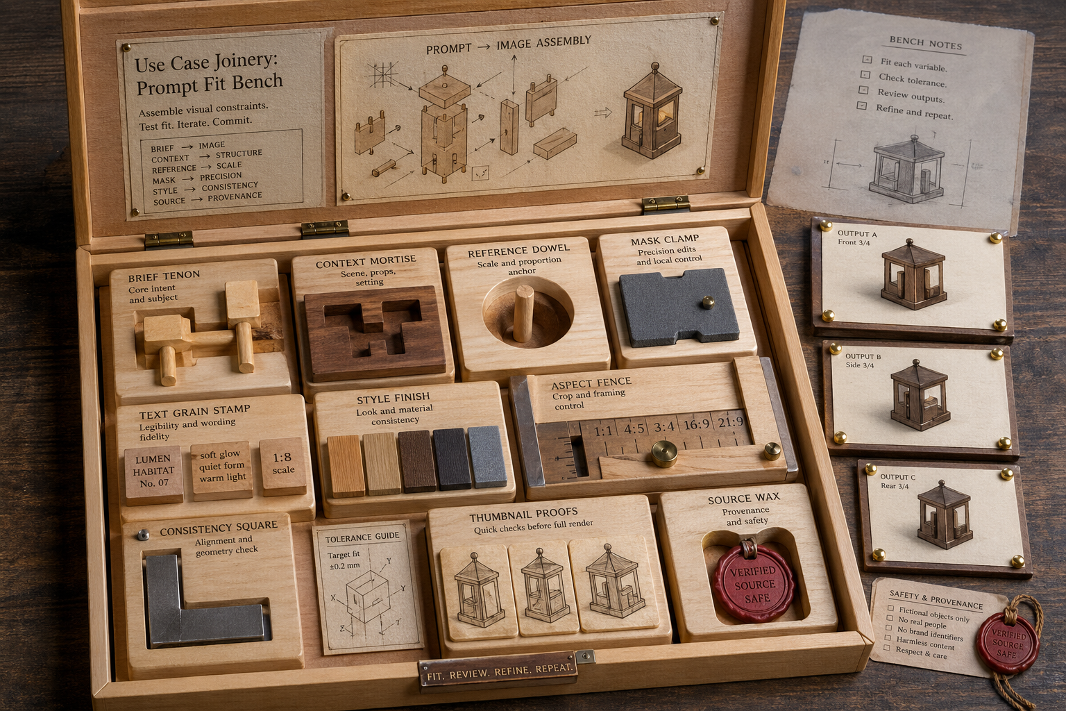 Create a single polished gallery image for an original GPT Image 2 use-case concept titled Use Case Joinery: Prompt Fit Bench. Show an oblique top-down tactile miniature joinery sample case in warm maple and walnut, with removable fictional wood blocks, mortise-and-tenon samples, dovetail slices, alignment squares, soft clamp pads, tiny thumbnail proof plaques, label stamps, sliding crop fences, and wax source tags. Use engraved labels for Brief Tenon, Context Mortise, Reference Dowel, Mask Clamp, Text Grain Stamp, Style Finish, Aspect Fence, Consistency Square, and Source Wax. The mechanism should read as prompt variables tested by physical fit and tolerance: edit precision through a removable soft clamp mask, text fidelity through stamped words on scrap blocks, style consistency through finish swatches, aspect control through sliding fences, and provenance through sealed source tags. Include three tiny fictional output plaques showing the same invented object family from different angles. Macro product photography mixed with crisp technical illustration, clean shadows, readable micro-labels, no active cutting tools, no hands, all objects fictional and unbranded.