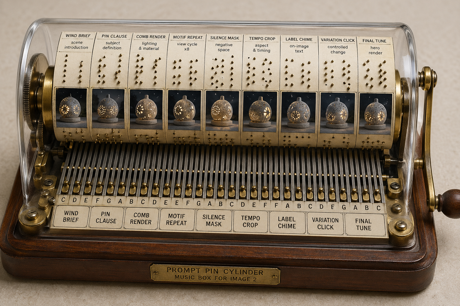 把 GPT Image 2 的提示规划做成一台透明音乐盒:Wind Brief、Pin Clause、Comb Render、Motif Repeat、Silence Mask、Tempo Crop、Label Chime、Variation Click 和 Final Tune 用滚筒针点、打孔纸带和音梳评测视觉节奏、重复 motif 和微标签清晰度。