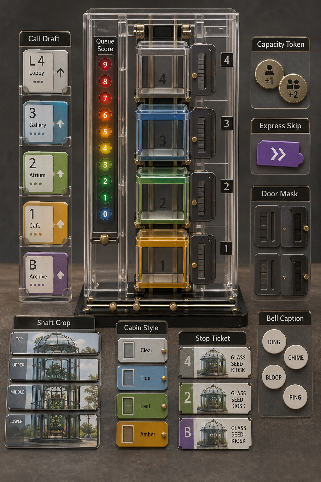 Create a single polished gallery image for a derived play concept titled Derived Play: Lift Queue Draft. It should be a different artifact from the dispatch shaft: show a compact vertical tabletop puzzle with four sliding glass elevator cars, magnetic floor-call cards, capacity tokens, express-skip tabs, door-mask shutters, bell-caption chips, shaft-crop rails, cabin-style swatches, stop tickets, and a queue-score counter. The gameplay mechanism is prompt scheduling: players draft call cards into an elevator queue, load at most two constraint tokens per car, may use one express skip, must open the mask door only on the matching floor, and score only when three stop tickets show the same invented glass seed kiosk with readable labels across different crops. Readable labels should include Call Draft, Capacity Token, Express Skip, Door Mask, Bell Caption, Shaft Crop, Cabin Style, Stop Ticket, and Queue Score. Output format: crisp product photo of a fictional vertical elevator-queue puzzle, transparent acrylic shaft, small brass sliders, colored queue lights, no board grid, no contact sheet, no hands, no logos, no real brands, no real people, no copyrighted characters, no political content, no dangerous instructions, no gore, no sexual content, no living artist style imitation.