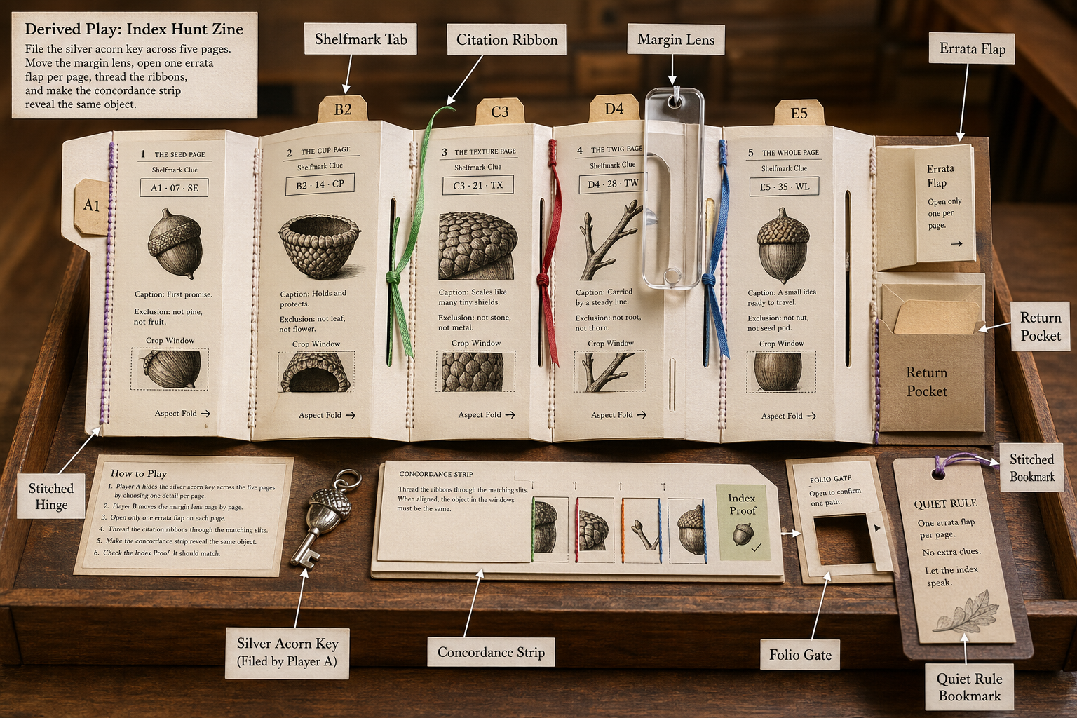 Create a single polished gallery image for a derived play concept titled Derived Play: Index Hunt Zine. It should be a different artifact from the catalog cabinet: show an accordion-fold library zine opened across a shallow reading tray, with stitched paper hinges, shelfmark tabs, citation ribbons threaded through page slits, a transparent margin lens bookmark, tiny return-pocket envelopes, errata flaps, concordance strips, folio gate windows, and a final quiet-rule bookmark. Avoid board grids, contact sheets, route maps, drafting games, token scoring tracks, prism hubs, elevator queues, courtroom benches, music-box stations, and 2x3 panels. Play mechanism: one player secretly files a fictional silver acorn key across five zine pages as shelfmark clues; the next player moves the margin lens bookmark page by page, opens only one errata flap per page, threads citation ribbons through matching slits, and must make the concordance strip reveal the same object without using any extra clues. The interaction tests prompt traceability, caption legibility, exclusion notes, crop windows, aspect folds, and style drift through a physical index hunt rather than a drafting board. Readable labels should include Shelfmark Tab, Citation Ribbon, Margin Lens, Return Pocket, Errata Flap, Concordance Strip, Folio Gate, Quiet Rule, and Index Proof. Output format: premium macro photograph of a harmless fictional fold-out paper zine in a wooden reading tray, crisp readable labels, cream paper, colored thread ribbons, no people, no hands, no logos, no real brands, no public figures, no copyrighted characters, no political content, no harmful instructions, no weapons, no gore, no sexual content, no living artist style imitation.