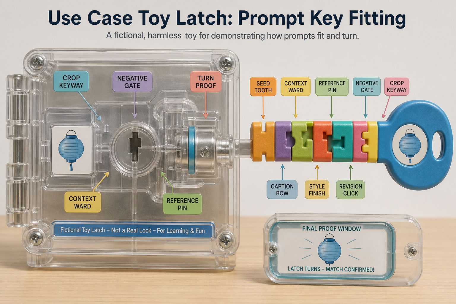 Create a single polished public-gallery image titled "Use Case Toy Latch: Prompt Key Fitting". Show one oversized transparent toy diary-latch mechanism on a clean studio workbench, clearly fictional and harmless, not a real security lock, not lockpicking, no tools for bypassing locks. The GPT Image 2 prompt is translated into a chunky colorful key-fitting instrument: Seed Tooth, Context Ward, Reference Pin, Negative Gate, Crop Keyway, Caption Bow, Style Finish, Revision Click, and Turn Proof. The same invented object, a tiny blue paper lantern, appears as an engraving on the key bow, a safe sticker inside the latch, and a final proof window after the toy latch turns. Output format: premium macro product photograph of one transparent acrylic latch and one oversized plastic key with modular tooth blocks, readable labels, soft daylight, no people, no hands, no brand marks, no logos, no public figures, no copyrighted characters, no political content, no harmful instructions, no weapons, no gore, no sexual or nude content, no living artist style imitation. Avoid contact sheets, 2x3 boards, cards, grids, research posters, optical benches, library cabinets, textiles, chessboards, elevators, marionettes, neon tubes, sand trays, terrariums, mosaics, music boxes, and courtroom scenes.