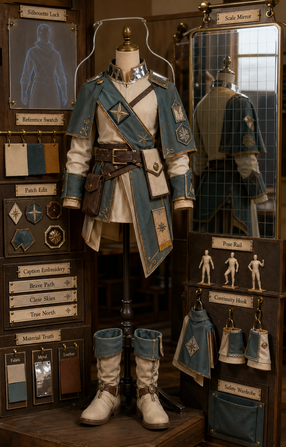 Create one polished public-gallery concept image titled "Use Case Costume: Prompt Wardrobe Check". Output format: a single vertical 4:5 fashion atelier fitting photograph, not a grid, not a contact sheet, not a board game, not a poster, not a textile toile, not a dress pattern sheet, not a puppet rig, not a choreography score, not a film stage, not a product catalog, not a library cabinet, not a courtroom, not an elevator, not a music box, not an optical bench, not a watch, not a greenhouse, not a tasting counter, not a fossil drawer, not a toy latch. Scene: a fictional stage-costume fitting alcove with one empty adjustable mannequin wearing a modular fantasy explorer outfit made from neutral rights-safe shapes: detachable cape panels, sleeve cuffs, utility sash, soft boots, mirrored collar plates, and removable embroidered patches. No people, no faces, no bodies beyond the mannequin form. The set is unbranded and invented. Mechanism: GPT Image 2 prompt design is expressed as wardrobe continuity checking instead of a machine. Show these readable labels as small sewn tabs, mirror labels, and brass tags: Silhouette Lock, Reference Swatch, Patch Edit, Caption Embroidery, Material Truth, Scale Mirror, Pose Rail, Continuity Hook, Safety Wardrobe. The silhouette lock is a translucent outline behind the mannequin; reference swatches sit on a small rail; patch edits are detachable patch zones; caption accuracy is tested by embroidered text tabs; material truth is shown with fabric/metal/leather-like sample cards that are clearly synthetic props; scale mirror is a gridded full-length mirror; pose rail shows three tiny stance markers; continuity hooks hold matching cape and boot pieces. Visual language: premium editorial atelier photography, warm oak, matte ivory mannequin, graphite mirror grid, muted teal and marigold tags, soft studio light, crisp shallow shadows, tactile close-up detail, short readable labels. Everything is fictional, original, unbranded, rights-safe, non-political, non-adult, non-graphic, and harmless. Avoid real marks, public figures, recognizable characters, celebrity likenesses, living-artist imitation, unsafe instructions, explicit material, graphic harm, and watermarks.