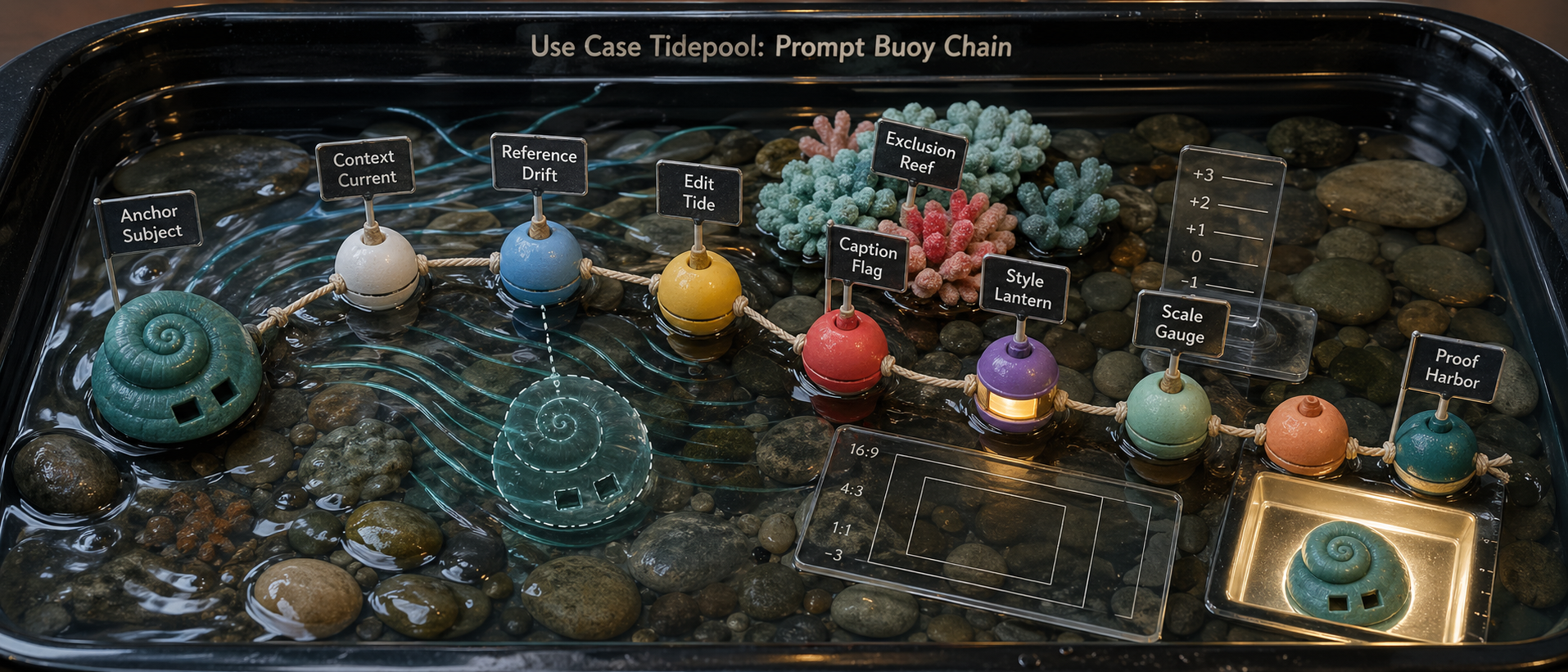 Create one polished public-gallery concept image titled "Use Case Tidepool: Prompt Buoy Chain". Output format: a single 21:9 panoramic tabletop water-diorama photograph, not a grid, not a contact sheet, not a poster, not a card layout, not a board game rectangle, not a library cabinet, not an elevator, not a toy latch, not a fossil drawer, not a wardrobe fitting, not a greenhouse, not a weather station, not a kite tunnel, not a planetarium, not a lantern slide, not a patchbay, not a proof press, not a loom, not a mosaic kiln, not a music box, not a sand tray, not a terrain model, not a courtroom, not a film stage. Scene: a shallow black enamel tray filled with clear water and smooth fictional tidepool stones. Across the water is one curved chain of small colorful floating buoys connected by thin cotton cord, with translucent acrylic tide rulers, tiny waterproof label flags, safe foam reef shapes, and a small illuminated proof window at the end showing the same invented object: a teal spiral shell with two square notches. No boats, no real navigation equipment, no people, no hands, no real places. Mechanism: GPT Image 2 prompt design is expressed as a buoy-chain calibration system. Show these readable labels on tiny flags, buoys, and transparent rulers: Anchor Subject, Context Current, Reference Drift, Edit Tide, Exclusion Reef, Caption Flag, Style Lantern, Scale Gauge, Proof Harbor. The anchor subject is the teal notched spiral shell; context current is shown by subtle flow lines in the water; reference drift is a translucent ghost-shell marker offset from the chain; local edit is one buoy moved into a new tide pocket; exclusions are safe foam reef blockers; text accuracy is tested by caption flags; style control is a small colored lantern buoy; scale and crop are checked by clear tide rulers; consistency is proven by the final proof harbor window repeating the shell exactly. Visual language: premium macro tabletop photography, glossy black enamel tray, clear rippling water, sea-glass teal, coral red, pearl white, graphite labels, tiny warm lantern glow, crisp reflections, highly readable short labels, tactile and playful but sophisticated. Everything is fictional, original, unbranded, rights-safe, non-political, harmless, non-adult, non-graphic. Avoid real brands, logos, public figures, celebrity likenesses, copyrighted characters, living-artist style imitation, weapons, dangerous procedures, gore, nudity, and watermark.