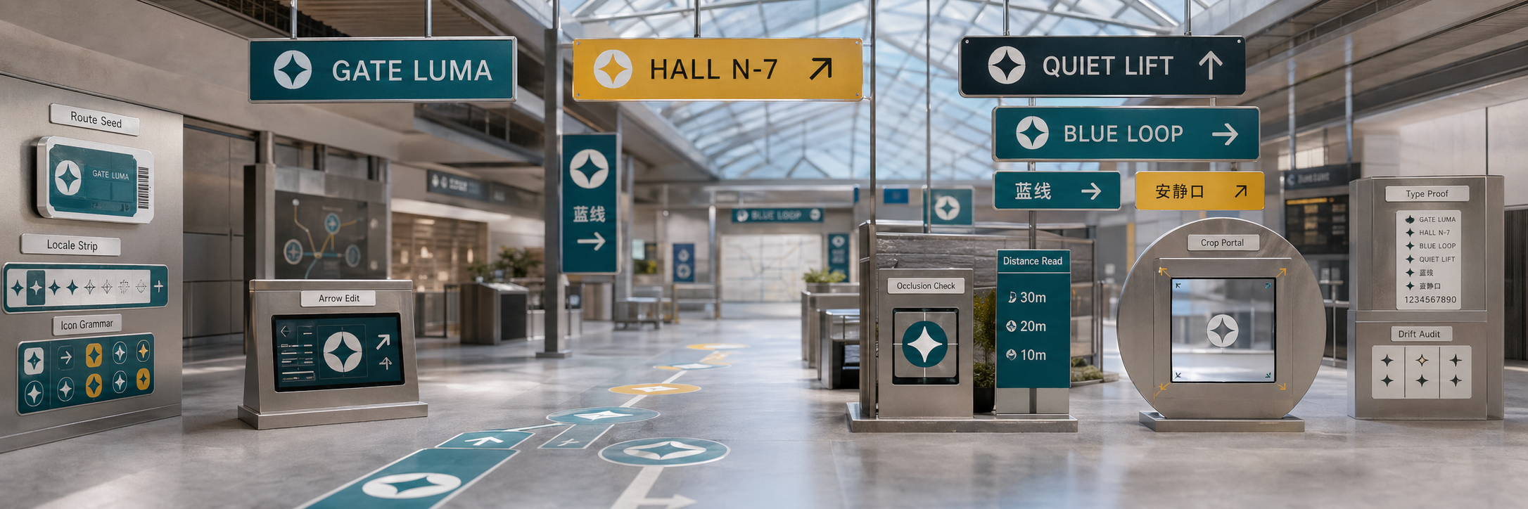 把 GPT Image 2 的文字、方向和局部遮挡能力做成虚构导视大厅质检:Route Seed、Locale Strip、Icon Grammar、Arrow Edit、Occlusion Check、Distance Read、Crop Portal、Type Proof 和 Drift Audit 用中英短标识、箭头、遮挡片和裁切门检查同一个星窗 glyph 在不同距离与画幅里是否仍可读。