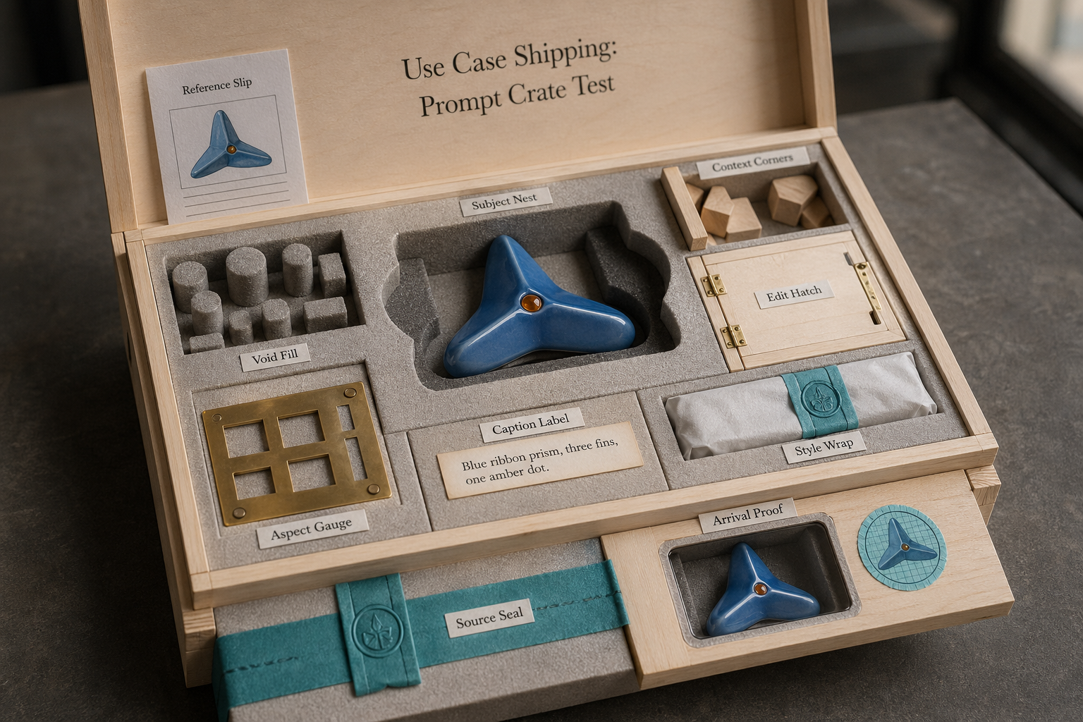 Create one polished public-gallery concept image titled "Use Case Shipping: Prompt Crate Test". Output format: one 3:2 low-oblique product photograph of a fictional miniature shipping stress-test crate opened on a matte studio table. It is not a grid, not a contact sheet, not a dashboard, not cards, not a board game, not a tray, not a cabinet, not a transit concourse, not a bakery deck, not a snowglobe, not a water basin, not a wardrobe, not a fossil drawer, not a toy latch, not a loom, not a proof press, not a patchbay, not an elevator shaft. Scene: an unbranded open crate made from pale basswood and soft recycled paper foam. The invented subject is a tiny ceramic "blue ribbon prism" with three rounded fins and one amber dot, nested inside a custom foam cutout. Around it are harmless miniature props: corner blocks, a reference packing slip, one hinged edit hatch, removable void-fill plugs, caption label strips, aspect-ratio crate gauges, style tissue wraps, tamper-evident source seals, and an arrival inspection window. No people, no hands, no real shipping labels, no logos. Mechanism: GPT Image 2 prompt control becomes a packaging robustness test. Short readable labels on physical pieces: Subject Nest, Context Corners, Reference Slip, Edit Hatch, Void Fill, Caption Label, Aspect Gauge, Style Wrap, Source Seal, Arrival Proof. The same blue ribbon prism must stay recognizable after every packaging stress: corner blocks test context changes, the slip tests reference identity, the hatch tests local edits, void fill blocks unwanted elements, caption labels test text, aspect gauges test framing, tissue wraps test style constraints, source seals mark provenance, and the inspection window repeats the object exactly. Visual language: premium tactile studio photography, pale wood crate, recycled grey paper foam, porcelain blue prism, amber dot, small brass gauges, teal inspection stickers, crisp readable labels, soft warehouse-window light, sophisticated playful artifact. Entire concept is fictional, original, unbranded, harmless, non-graphic, and rights-safe.