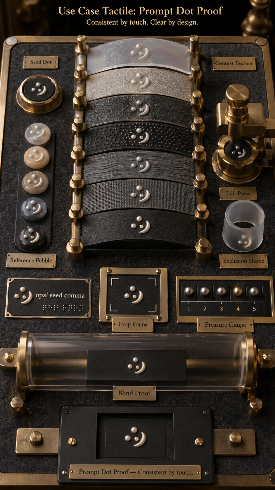 Use Case Tactile: Prompt Dot Proof. Make one vertical 9:16 tactile-proofing workbench photograph. A fictional brass-and-felt embossing table holds curved sample ribbons of raised dot patterns, silicone finger sleeves, one translucent blind-test tunnel, pressure beads, crop frames, caption plaques, reference pebble tokens, and a final matte-black proof window. The invented subject is an opal seed comma tactile glyph: three raised pearl dots with one crescent ridge, repeated consistently on each strip. Labels: Seed Dot, Context Texture, Reference Pebble, Edit Press, Exclusion Sleeve, Caption Plate, Crop Frame, Pressure Gauge, Blind Proof. The same tactile glyph must remain recognizable by sight and touch across texture changes, local press edits, covered marks, text plates, crop frames, relief-depth gauges, and blind proofing. Keep it fictional, no-people, unbranded, harmless, not a real tactile writing system, not a grid, not a contact sheet, not a music box cylinder, not an abacus, not a proof press, and not a library cabinet.