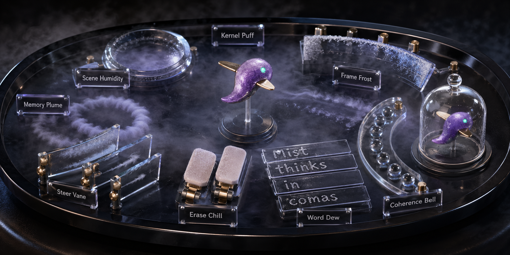 Create one polished public-gallery concept image titled "Use Case Vapor: Prompt Condensation Chamber". Output format: a single 2:1 panoramic macro product photograph of a fictional tabletop condensation chamber: a shallow black acrylic oval with safe cool mist, illuminated dew trails, chilled glass vanes, dew-writing strips, memory plume rings, soft eraser paddles, frame frost arcs, coherence beads, and a clear holding bell. The invented subject is a pearlescent violet comma comet with two brass fins and one mint dot, repeated exactly inside the final bell. Mechanism labels: Kernel Puff, Scene Humidity, Memory Plume, Steer Vane, Erase Chill, Word Dew, Frame Frost, Coherence Bell, Trace Hold. Show prompt control as condensation behavior: humidity changes context, plume rings preserve memory, vanes steer instructions, eraser paddles remove stray curls, dew-writing tests short text, frost arcs change framing, beads test consistency, and the bell holds the same subject. No people, no hands, no logos, no real lab equipment, no real radiation, no dangerous procedure. Premium tactile studio photography, black acrylic, cool mist, pearlescent violet, mint accent, clear glass, brass hardware, crisp readable tiny labels; fictional, original, unbranded, harmless, rights-safe.