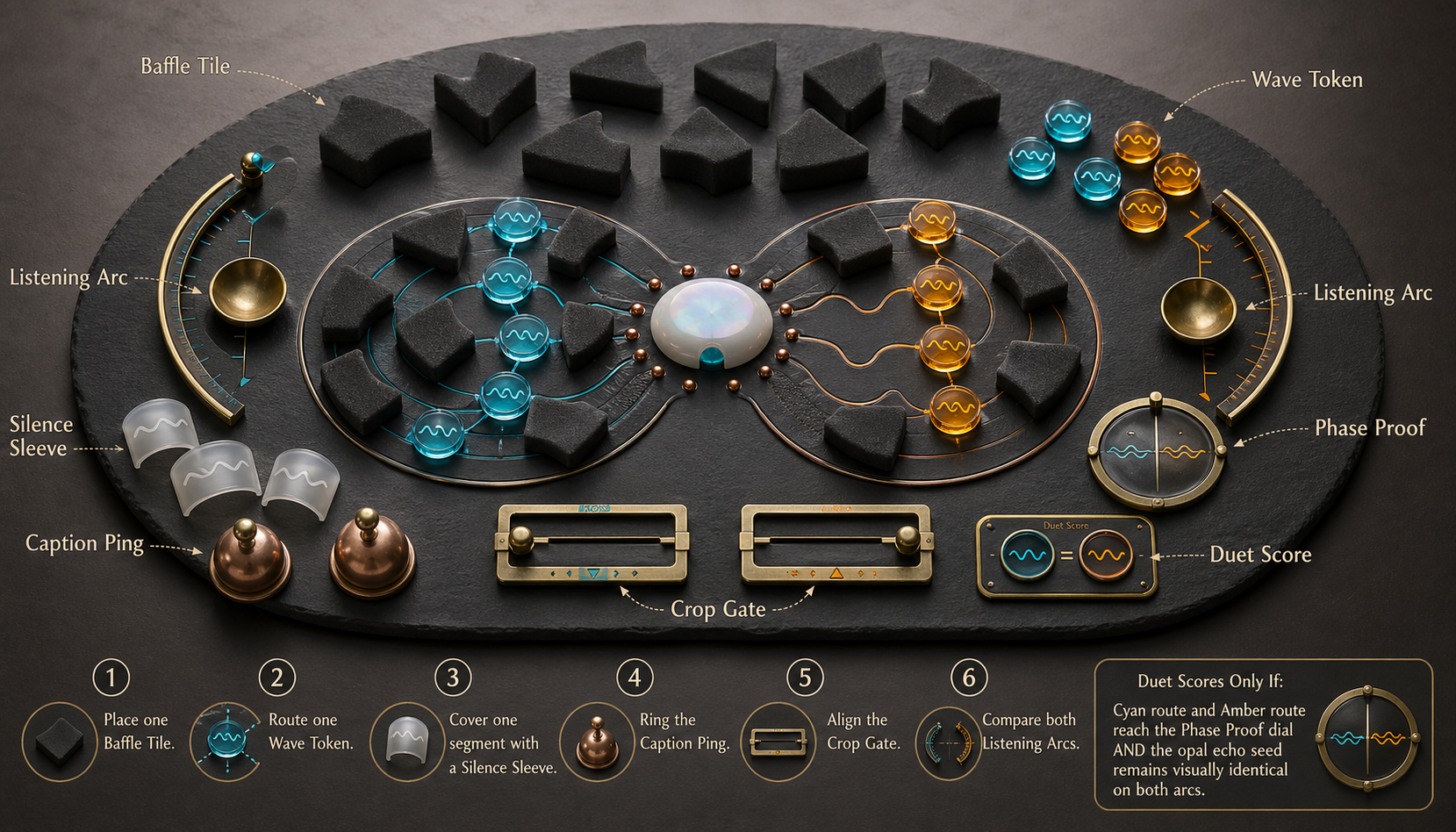 从回声室派生出的双人声学拼图:玩家交替放 Baffle Tile、走 Wave Token、套 Silence Sleeve、敲 Caption Ping、对齐 Crop Gate,再比较两侧 Listening Arc;只有青色和琥珀两条路径都抵达 Phase Proof,且 opal echo seed 在两侧仍完全一致,才得到 Duet Score。