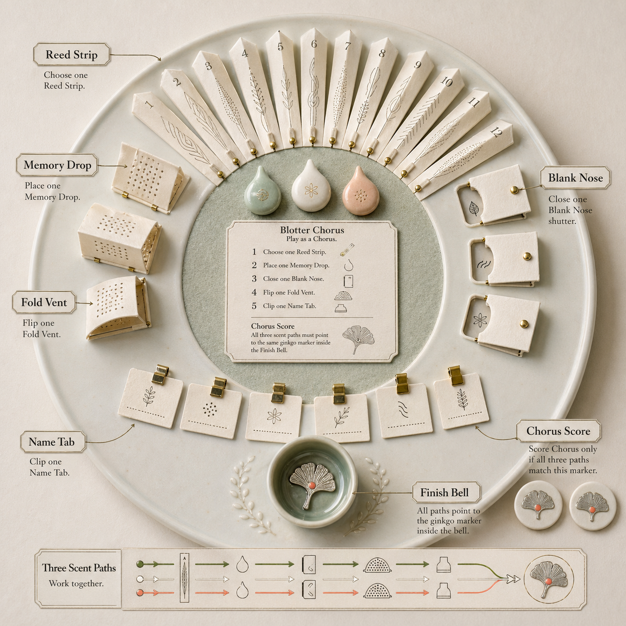 从香氛试纸风琴派生的合作声部路径玩法:玩家选 Reed Strip、放 Memory Drop、关 Blank Nose、翻 Fold Vent、夹 Name Tab;只有三条气味路径都指向 Finish Bell 里的同一枚银色银杏香标,才得到 Chorus Score。