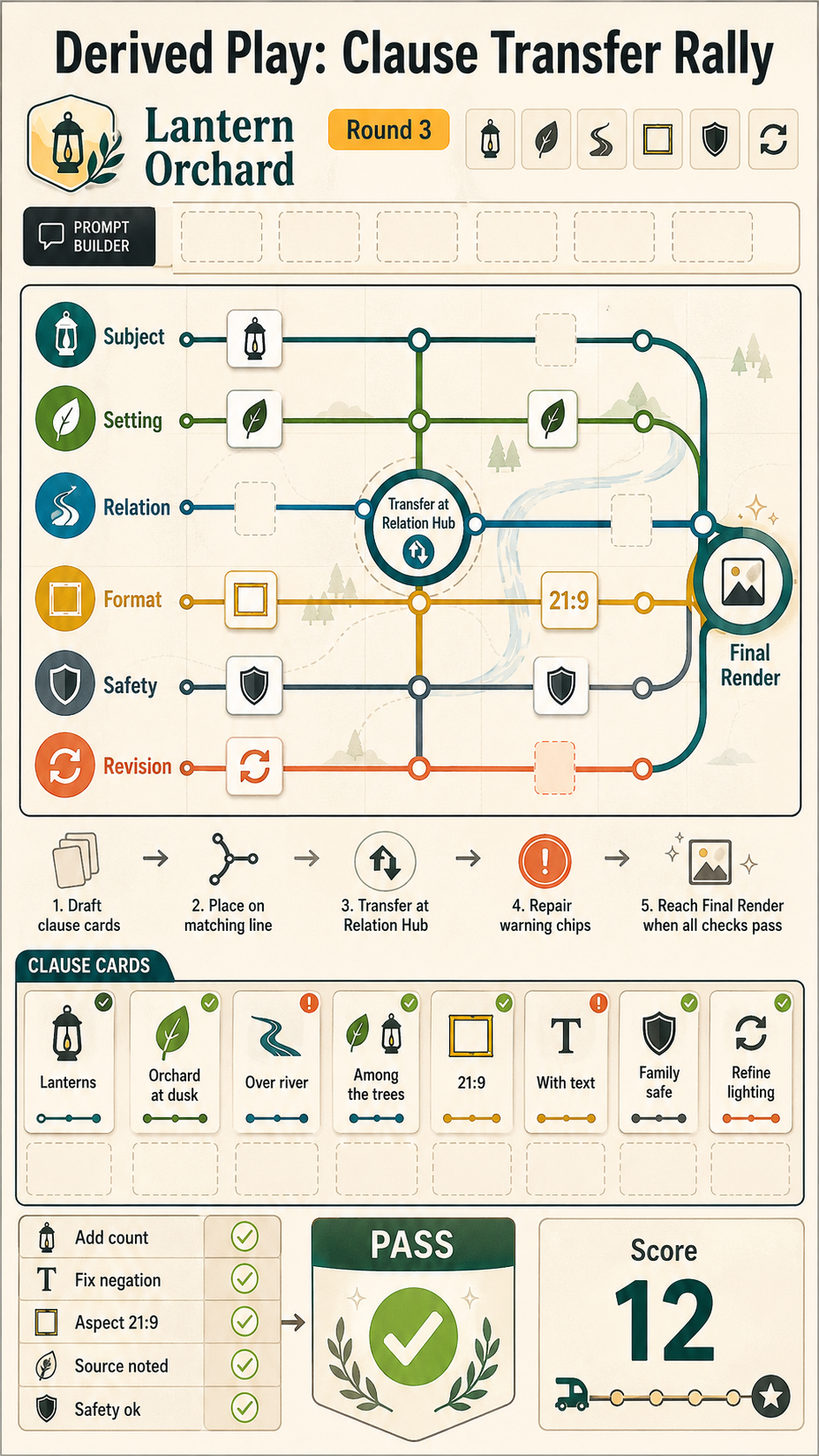 Create one polished public-gallery concept image titled exactly "Derived Play: Clause Transfer Rally". Output format: one vertical 9:16 playable rules poster / fictional creative challenge screen, not a physical board game photo, not a tabletop object, not a contact sheet, not a storyboard, not a real transit map. It should feel like a public gallery artifact that explains a playable prompt-debugging game. Scene: a fictional challenge interface derived from the Prompt Clause Transit Map. Players move short prompt-clause cards through a transit-style route to build a valid image prompt for a fictional project called "Lantern Orchard". The screen has a large route diagram in the middle, a small prompt input area at top, a "clause cards" tray drawn as flat UI cards, and a scoring panel at bottom. Use abstract icons only: lantern, leaf, river curve, blank image frame, shield, and refresh arrow. Exact short readable text to render: "Derived Play: Clause Transfer Rally", "Lantern Orchard", "Round 3", "Subject", "Setting", "Relation", "Format", "Safety", "Revision", "Transfer at Relation Hub", "Fix negation", "Add count", "Aspect 21:9", "Source noted", "PASS", "Score 12". Keep all text short and legible; do not add long paragraphs or random placeholder text. Gameplay mechanism: players draft clause cards, place each card on the matching transit line, transfer at Relation Hub when two clauses interact, repair warning chips, then reach Final Render only when count, text, aspect, source, and safety checks pass. Show a few empty slots and a clear visual path from draft cards to final score. Visual style: sophisticated game-like product UI, crisp flat information design, warm off-white canvas, graphite typography, teal route lines, amber highlights, moss green success marks, coral warning chips, compact icon buttons. The design should be lively and playful without looking like a children\u2019s worksheet. No purple-dominant gradient, no decorative orbs, no watermark. Safety and rights: fictional project and fictional game only, no real transit agency, no real city, no logos, no trademarks, no public figures, no politics, no dangerous instructions, no adult or explicit content, no gore or violence, no copyrighted characters, no living-artist style imitation, no source image reuse.