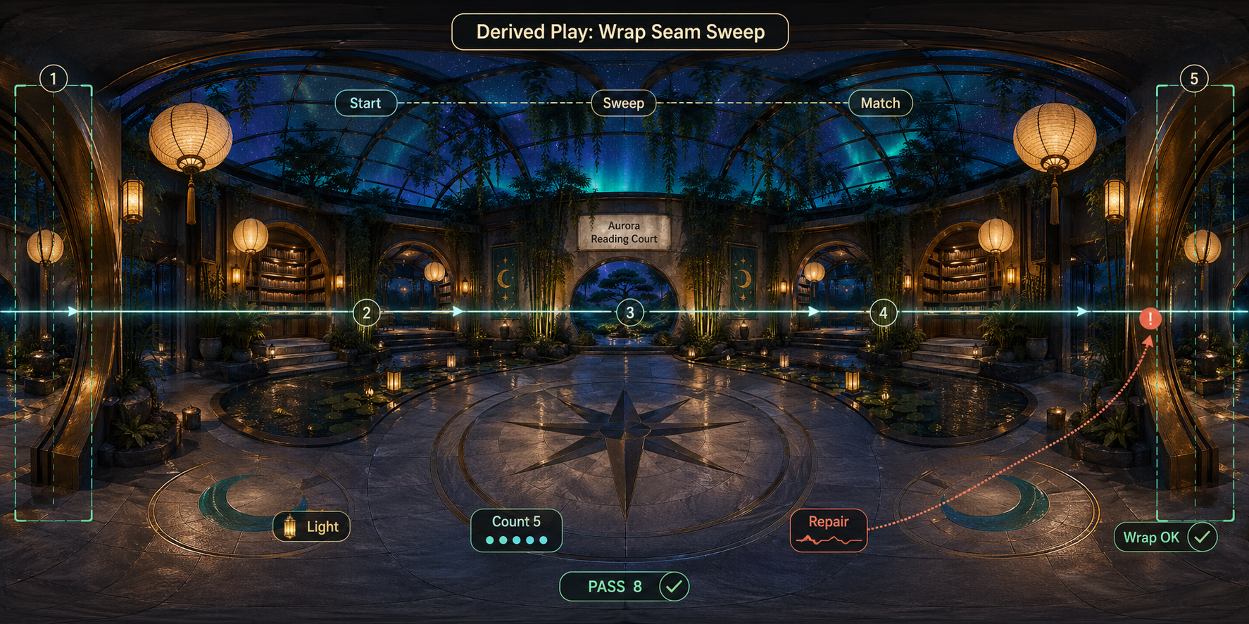 Create one polished public-gallery concept image titled exactly "Derived Play: Wrap Seam Sweep". Output format: one ultra-wide 2:1 playable panorama QA overlay, full-bleed immersive 360 scene with game rules embedded as short labels. It must not be a physical tabletop object, not a board game photo, not a device, not a tray, not a lab bench, not a map, not a comic, not a worksheet, not a contact sheet, and not a dashboard-first UI. The environment should dominate, with translucent game overlays. Scene: same fictional no-people Aurora Reading Court, but now shown as a wraparound seam-check challenge. Keep the circular reading courtyard, brass moon gate split across the far left and far right edges, glass ceiling ribs, paper lanterns, shallow reflecting channel, tiled floor compass motif, curved book alcoves, and plants. Make the left and right edges intentionally comparable: matching gate curve, matching lantern pair, matching floor tile line. Derived gameplay mechanism: players sweep a thin glowing path across the panorama and verify continuity. Add compact overlay labels only: "Derived Play: Wrap Seam Sweep", "Start", "Sweep", "Match", "Light", "Count 5", "Repair", "Wrap OK", "PASS 8". Show five small numbered anchor pips along the horizon and seam windows, but keep numbers tiny and readable: "1", "2", "3", "4", "5". Show one coral repair ribbon near a slight seam warning, then a green pass chip at the opposite edge. Composition: seamless 2:1 panorama feeling, horizon centered, full-bleed immersive environment, no people, no UI cards, no dense paragraphs. The game overlay should look like transparent acetate on a 360 preview: hairline guides, small chips, one continuous sweep path, edge comparison brackets, and anchor pips. Use warm amber lantern light, deep teal shadow, graphite guide lines, ivory text, small coral repair mark, green pass marks. Safety and rights: fictional location and fictional game only, no real brands, no trademarks, no public figures, no politics, no elections, no dangerous instructions, no adult or explicit content, no gore or violence, no copyrighted characters, no living-artist style imitation, no source image reuse, no watermark.