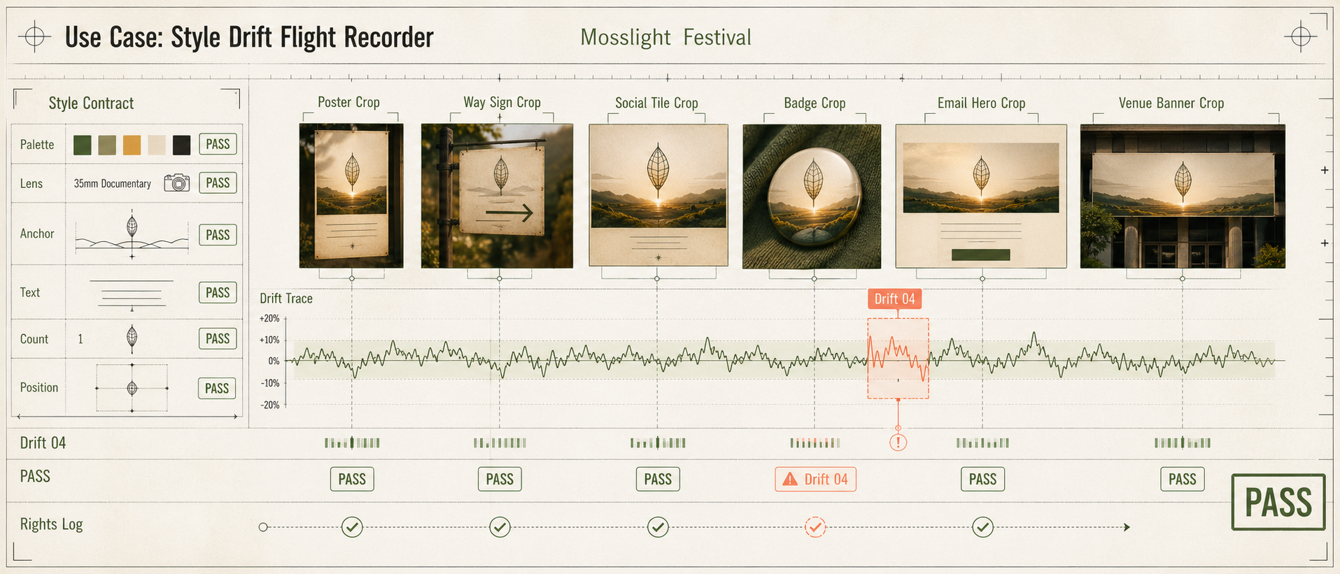 Create one polished public-gallery concept image titled exactly "Use Case: Style Drift Flight Recorder". Output format: one ultra-wide 21:9 creative-operations flight-recorder strip, a continuous trace artifact for GPT Image 2 visual consistency testing. It must not be a physical tabletop object, not a device, not a tray, not a lab bench, not a contact sheet, not a comic, not a map, not a worksheet, not a generic SaaS dashboard. It should feel like a long editorial control-room wall display and consistency log for a fictional visual system. Scene: a fictional no-brand public visual system called "Mosslight Festival". Show a row of small generated asset thumbnails embedded inside one continuous recorder timeline: poster crop, way sign crop, social tile crop, badge crop, email hero crop, and venue banner crop. The assets share the same invented visual contract: moss green, warm amber, ivory paper, graphite linework, one simple lantern-leaf icon, centered horizon, 35mm documentary framing, soft side light. No real logos, no real event, no real city. GPT Image play mechanism shown visually: a drift waveform runs across the whole strip and compares each generated asset to the style contract. Add compact overlay labels only: "Use Case: Style Drift Flight Recorder", "Mosslight Festival", "Style Contract", "Palette", "Lens", "Anchor", "Text", "Count", "Position", "Rights Log", "Drift 04", "PASS". Show tiny QA chips: green pass chips for Palette, Lens, Anchor; one coral warning chip at Drift 04; one small rights-log tick. Keep all text short, readable, and exactly as listed; do not add random placeholder text. Composition: a single connected horizontal artifact with a left style-contract panel, central drift trace waveform, asset thumbnails integrated into the trace, and a right pass stamp. Use precise alignment, hairline guides, small feature tags, mini color swatches, visual comparison brackets, and subtle scanline/ruler marks. The scene should communicate that GPT Image 2 can generate a campaign system and then audit consistency, attribution, and failure modes. Visual style: high-end editorial information design mixed with soft cinematic thumbnails; matte off-white background, graphite typography, moss green linework, amber highlights, ivory cards, restrained coral warning, no purple-dominant gradient, no decorative orbs. Full-bleed, crisp, gallery-worthy. Safety and rights: fictional visual system only, no real brands, no trademarks, no public figures, no politics, no elections, no dangerous instructions, no adult or explicit content, no gore or violence, no copyrighted characters, no living-artist style imitation, no source image reuse, no watermark.