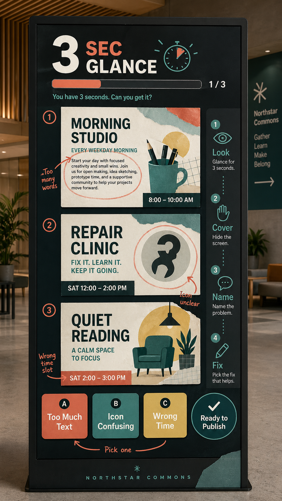 从 dayparted 数字标牌工作流派生出的三秒扫读玩法:观众在虚构 Northstar Commons 屏幕上快速找出 too much text、icon confusing、wrong time 三类问题,再选择修复并发布。