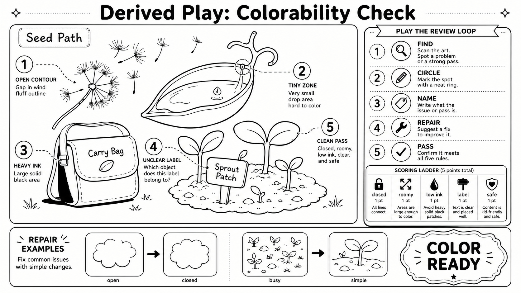 Create one polished public-gallery concept image titled exactly "Derived Play: Colorability Check". Use case: derived play mechanic / printable QA game / line-art review. Asset type: landscape 16:9 black-and-white printable challenge sheet for a GPT Image 2 gallery. Primary request: Derive a playable review game from Coloring Lesson Forge. Players inspect an AI-generated coloring page and mark whether it is actually colorable: closed contours, large enough regions, clear labels, safe subject, and low ink. This must be a flat printable challenge sheet, not a tabletop game photo, not a dashboard, not a menu, not a map, not a comic strip, and not a 2x3 contact sheet. Composition: left two-thirds shows a simplified fictional coloring page excerpt titled "Seed Path" with four line-art areas: wind fluff, water pod, carry bag, sprout patch. Place five numbered inspection rings on the artwork. Each ring points to a different issue or pass condition: one open contour, one tiny color zone, one heavy ink patch, one unclear label, one clean pass region. Keep the line art original, simple, black ink on warm white paper. Right third shows a vertical game rail with five short steps: "Find", "Circle", "Name", "Repair", "Pass". Under it show a compact scoring ladder with readable labels: "closed", "roomy", "low ink", "label", "safe". Bottom strip shows two repair examples as tiny before/after contour snippets labeled "open" -> "closed" and "busy" -> "simple". Add a final badge "COLOR READY". Visual style: refined printable classroom design exercise, black-and-white line art with a few gray dotted guide marks, crisp typography, generous spacing, clean hierarchy, low-ink aesthetic, professional but playful. The game should clearly show a human evaluation loop for GPT Image 2 outputs: generated coloring pages become inspectable artifacts with concrete QA rules. Safety and originality constraints: fictional classroom material only; no real students, no real teachers, no faces, no real school names, no brands, no logos, no public figures, no politics/elections/parties, no medical/legal claims, no hazardous instructions, no adult or explicit content, no gore, no celebrity likeness, no copyrighted characters, no living-artist style imitation. Do not copy any external prompt, coloring page, article image, product UI, source image, artwork, character, or protected style.