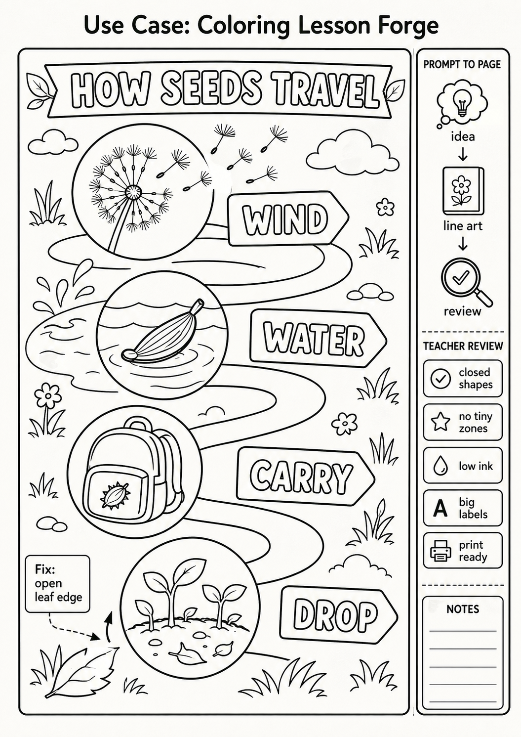 Create one polished public-gallery concept image titled exactly "Use Case: Coloring Lesson Forge". Use case: printable education material / AI image workflow / low-ink line-art production. Asset type: portrait A4 black-and-white teacher proof sheet for a GPT Image 2 gallery. Primary request: Show GPT Image 2 being used to transform one safe fictional classroom topic into a printable coloring lesson page with built-in teacher review. This must be a flat printable line-art proof, not a physical desk photo, not a dashboard, not a menu, not a map, not a comic strip, not a 2x3 board, and not a product mockup. Fictional low-stakes lesson only: "How seeds travel". Keep it simplified and non-authoritative; the image is about printable visual production and review, not a definitive textbook page. Composition: one portrait A4 page preview in clean black ink on warm white paper. The center is a large coloring-page scene with four clearly separated seed-travel mini vignettes arranged along one winding path: "Wind", "Water", "Carry", "Drop". Use original simple icons only: dandelion-like fluff, floating seed pod, backpack with seed sticker, sprout patch. Each vignette must have thick clean outlines, no gray shading, many enclosed white regions large enough to color, and wide margins. Add a narrow teacher review rail on the right with short readable checklist chips: "closed shapes", "no tiny zones", "low ink", "big labels", "print ready". Add a small top strip labeled "Prompt to Page" with three tiny process marks: "idea", "line art", "review". Add one small note box with readable text: "Fix: open leaf edge" and an arrow to one deliberately open contour. Keep all in-image text short and legible. Visual style: premium educational print design, crisp vector-like black line art, subtle paper grain, no color except tiny graphite/gray registration marks if needed, generous whitespace, strong hierarchy, professionally printable. The image should visibly demonstrate GPT Image 2 as a workflow for generating classroom coloring pages that can be reviewed for line quality and print usability. Safety and originality constraints: fictional classroom material only; no real students, no real teachers, no faces, no real school names, no brands, no logos, no public figures, no politics/elections/parties, no medical/legal claims, no hazardous instructions, no adult or explicit content, no gore, no celebrity likeness, no copyrighted characters, no living-artist style imitation. Do not copy any external prompt, coloring page, article image, product UI, source image, artwork, character, or protected style.