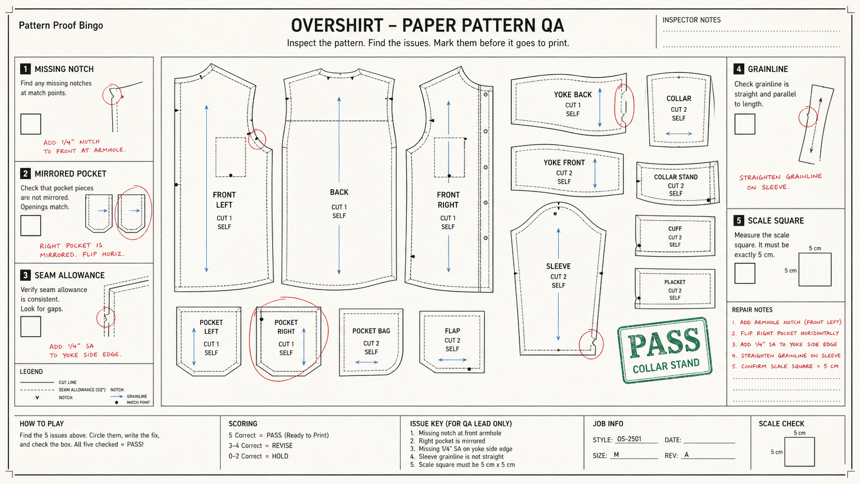 从 Tech Pack Translator 派生出的纸样审核玩法:玩家在虚构 overshirt pattern 上找 missing notch、mirrored pocket、seam allowance gap、bad grainline 和 scale-square 问题,再写 repair note 后通过。