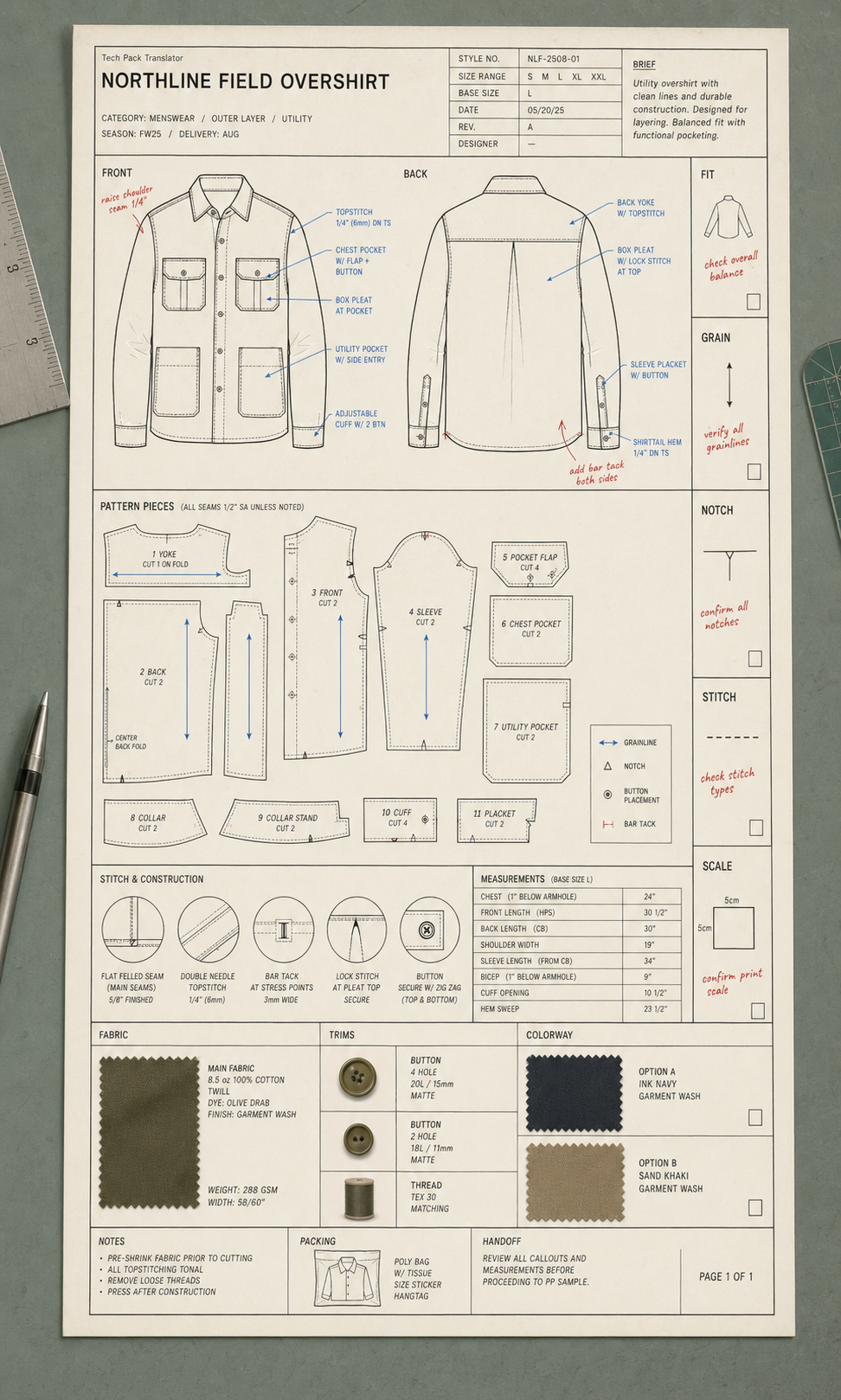 Create one polished public-gallery concept image titled exactly "Use Case: Tech Pack Translator". Use case: productivity-visual / fashion production handoff / technical drawing workflow. Asset type: portrait A3 fashion tech-pack proof sheet for a GPT Image 2 gallery. Primary request: Show GPT Image 2 turning a fictional garment brief into a production handoff sheet. The artifact must be a no-people, no-brand technical document, not a product ad, not runway/editorial fashion, not a marketplace listing, not a dashboard, not a menu, not a map, not a comic, and not a 2x3 research board. Composition: one tall A3 tech pack proof on a muted drafting table. The fictional garment is "Northline Field Overshirt", with no logo and no real brand. Show crisp front and back technical flats in black line art. Below them show exploded paper pattern pieces with labels, grainline arrows, notches, dashed seam allowance lines, pocket pieces, yoke, sleeve, collar, collar stand, cuff, placket, and a 5 cm print scale square. Add construction callouts for topstitch, bar tack, button placement, sleeve placket, hem, and pocket flap. Add a small bill-of-materials zone with generic fabric swatches and trims. Add a right-side reviewer rail with short labels: "FIT", "GRAIN", "NOTCH", "STITCH", "SCALE". Visual style: production-document clarity, crisp vector-like linework, subtle paper texture, cream paper, thin red review marks, blue construction callouts, graphite typography, practical workshop proofing mood. The document should feel inspectable and useful as a manufacturer-facing handoff preview. Safety and originality constraints: fictional garment only; no real apparel brand, no logo, no marketplace listing, no celebrity/model/person, no face, no mannequin, no protected costume, no cosplay, no real designer name, no real body measurements, no medical/legal/safety claim, no public figures, no politics/elections/parties, no harmful instructions, no adult/explicit content, no gore, no copyrighted characters, no living-artist style imitation. Do not copy any external prompt, sewing pattern, dataset sample, article image, product UI, source image, artwork, garment design, layout, or protected style.