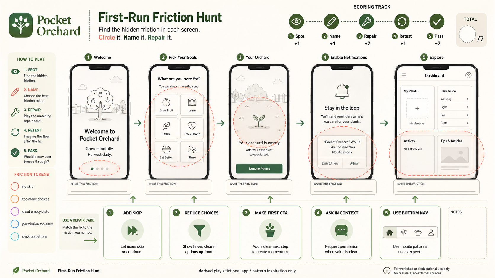 Use case: ui-mockup / derived play mechanic: first-run-friction-hunt Asset type: GPT Image 2 derived-play gallery image, wide 16:9 printable UX QA game overlay Primary request: Create a polished derived play image titled "First-Run Friction Hunt". It should look like an original usability game built from a fictional mobile onboarding flow for "Pocket Orchard". Show a single continuous horizontal tap-through strip with five simplified phone snapshots, each overlaid with one hidden friction token for players to find, circle, name, and repair. Game mechanic: Players use colored annotation tokens to identify: "no skip", "too many choices", "dead empty state", "permission too early", "desktop pattern". Then they place repair cards below the flow: "add skip", "reduce choices", "make first CTA", "ask in context", "use bottom nav". Include a small scoring track: Spot, Name, Repair, Retest, Pass. Composition: Not a 2x2 or 2x3 grid. Make it a long playmat-style UX audit strip with phone snapshots, transparent red issue halos, green repair arrows, and a bottom row of repair cards. The artifact should be clearly digital/printable, not a physical tabletop game photo. Text: Keep all text short and readable. Include footer stamp "derived play / fictional app / pattern inspiration only". Include a tiny safety/source note icon but no external URLs in the image. Visual style: clean product-design workshop aesthetic, off-white background, graphite UI wireframes, muted orchard green, coral issue markers, crisp icons, professional editorial polish. Avoid: no real brands, no real platform logos, no app-store badges, no real people or faces, no public figures, no politics, no medical/legal/financial advice, no copyrighted characters, no copied UI, no dense tiny text, no dashboard, no menu, no map, no physical controller, no macro product shot, no 2x3 research board.