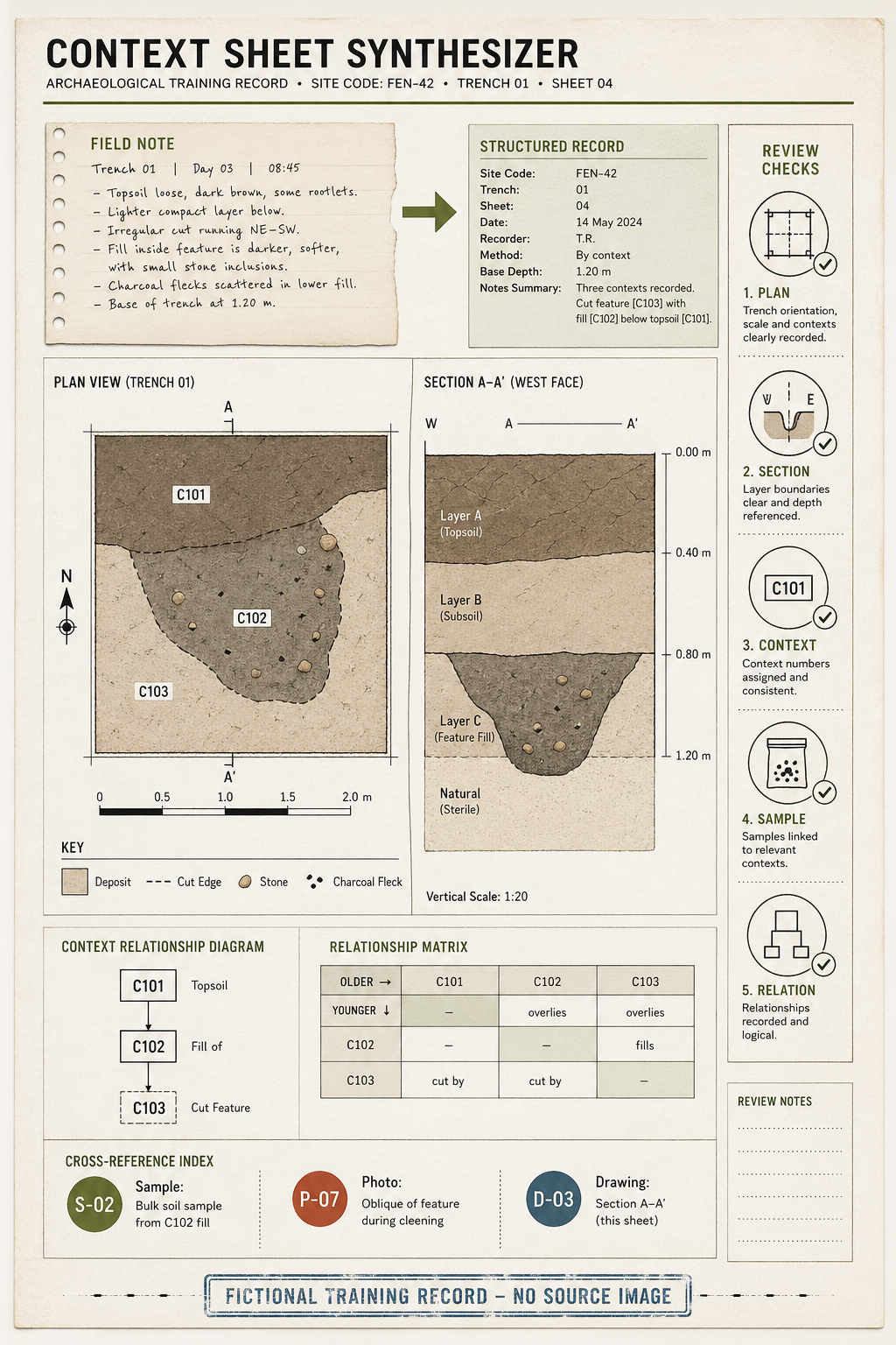 Create a single polished GPT Image 2 use-case image titled visually as a fictional archival field-record sheet, not a product photo and not a grid board. Use case name: Context Sheet Synthesizer. Primary scene: a tall portrait cultural-heritage documentation dossier for a completely fictional excavation training site code "FEN-42". The image should look like one coherent printed field-record page laid flat in clean daylight, with no hands, no people, no real institution logos, no real archaeological site, no real artifact, and no culturally specific motif. Core visual structure: - Top strip: a short source note block labeled "FIELD NOTE" with generic invented text fragments, then an arrow to "STRUCTURED RECORD". - Main left area: clean technical plan view of a square trench with abstract soil patches, context numbers C101, C102, C103, north arrow, scale bar, and a simple key for deposit, cut edge, stone, charcoal fleck. Keep shapes generic and invented. - Main right area: vertical section drawing with layered soil bands labeled Layer A, Layer B, Layer C, with crisp boundaries and measurement ticks. - Lower band: mini relationship matrix using simple boxes C101 above C102, C102 fills C103, plus sample/photo cross-reference chips S-02, P-07, D-03. - Side review rail: five compact checks with readable labels: PLAN, SECTION, CONTEXT, SAMPLE, RELATION. - Footer stamp: "fictional training record - no source image". Style: publication-quality technical illustration mixed with modern archive layout, off-white paper, fine black ink, muted earth accent colors, measured lines, clean typography, high legibility, restrained but rich design. Avoid 2x3 contact sheet composition, avoid dashboard look, avoid macro product shot, avoid physical apparatus, avoid real brands, avoid political symbols, avoid religious symbols, avoid human remains, avoid weapons, avoid gore. Make it visually fresh and publicly displayable.