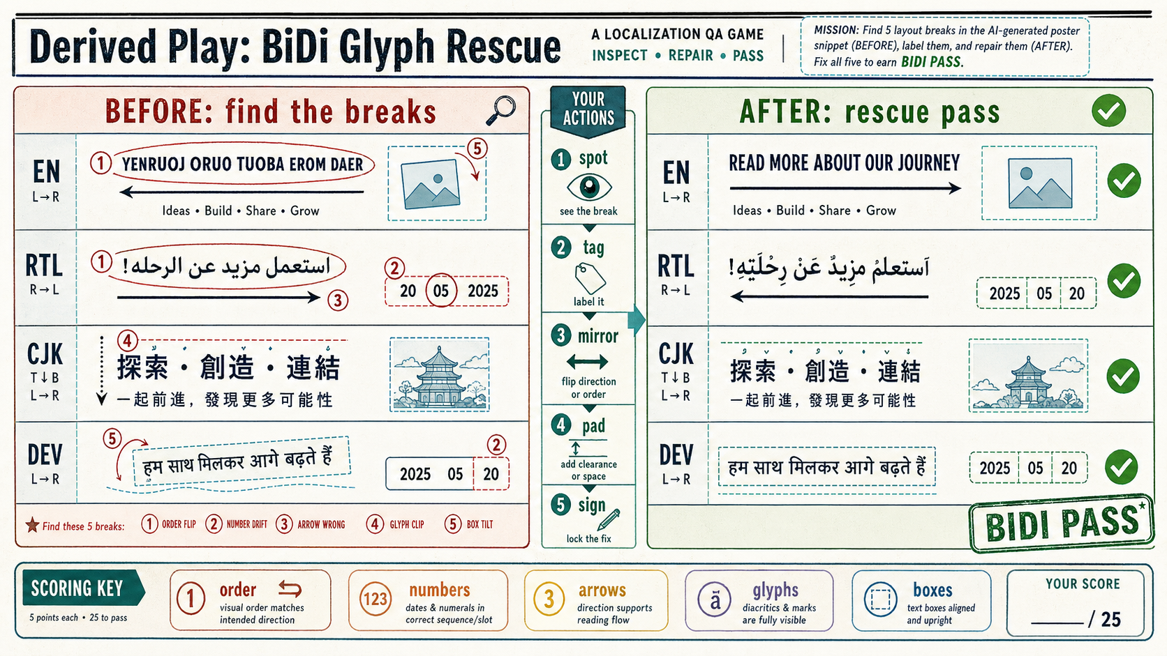从 Multilingual Poster Preflight 派生出的双向文本 QA 玩法:玩家在 before/after 多语种版面中 spot、tag、mirror、pad、sign 五类问题,包括 order flip、number drift、arrow wrong、glyph clip 和 box tilt。