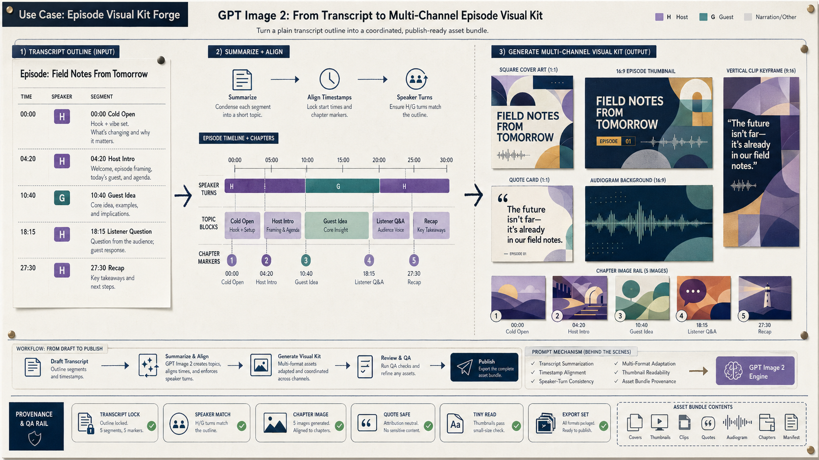 Create a wide 16:9 fictional podcast production artifact titled in small clear text "Use Case: Episode Visual Kit Forge". Show how GPT Image 2 can turn a plain transcript outline into a coordinated multi-channel episode visual kit. Scene/backdrop: a clean audio-production planning wall, matte paper and crisp editorial mockup assets pinned flat, not a product photo, not a tabletop game, not a physical control device. Main structure: center-left shows a compact transcript input strip for a fictional episode named "Field Notes From Tomorrow" with invented neutral segments only: 00:00 cold open, 04:20 host intro, 10:40 guest idea, 18:15 listener question, 27:30 recap. Use abstract speaker labels H and G, no real names. Center shows a horizontal timeline with speaker-turn bands, timestamp ticks, topic blocks, and chapter markers. Right side shows the generated visual kit as clearly different formats: square cover art placeholder, 16:9 thumbnail frame, vertical clip keyframe, quote card, audiogram background with waveform lane, and chapter image rail. Bottom has a provenance and QA rail with chips: TRANSCRIPT LOCK, SPEAKER MATCH, CHAPTER IMAGE, QUOTE SAFE, TINY READ, EXPORT SET. Visual details: make the assets look coordinated but not branded: invented typography, varied restrained color palette, abstract geometric imagery, waveform motifs, chapter thumbnails as nonliteral graphic scenes, readable labels. Include small arrows showing transcript-to-summary-to-assets workflow and a draft-to-publish gate. Prompt mechanism shown: transcript summarization, timestamp alignment, speaker-turn consistency, multi-format adaptation, thumbnail readability, asset bundle provenance. Safety and originality constraints: no real podcast, no real host or guest, no faces or portraits, no platform logos, no real brands, no copyrighted shows, no celebrities, no political topics, no elections or parties, no true-crime violence imagery, no weapons, no harmful instructions, no medical/legal/financial claims, no adult or explicit content, no gore, no living-artist style imitation, no copied UI, no copied prompt text, no source image reuse, no 2x2 or 2x3 research board.