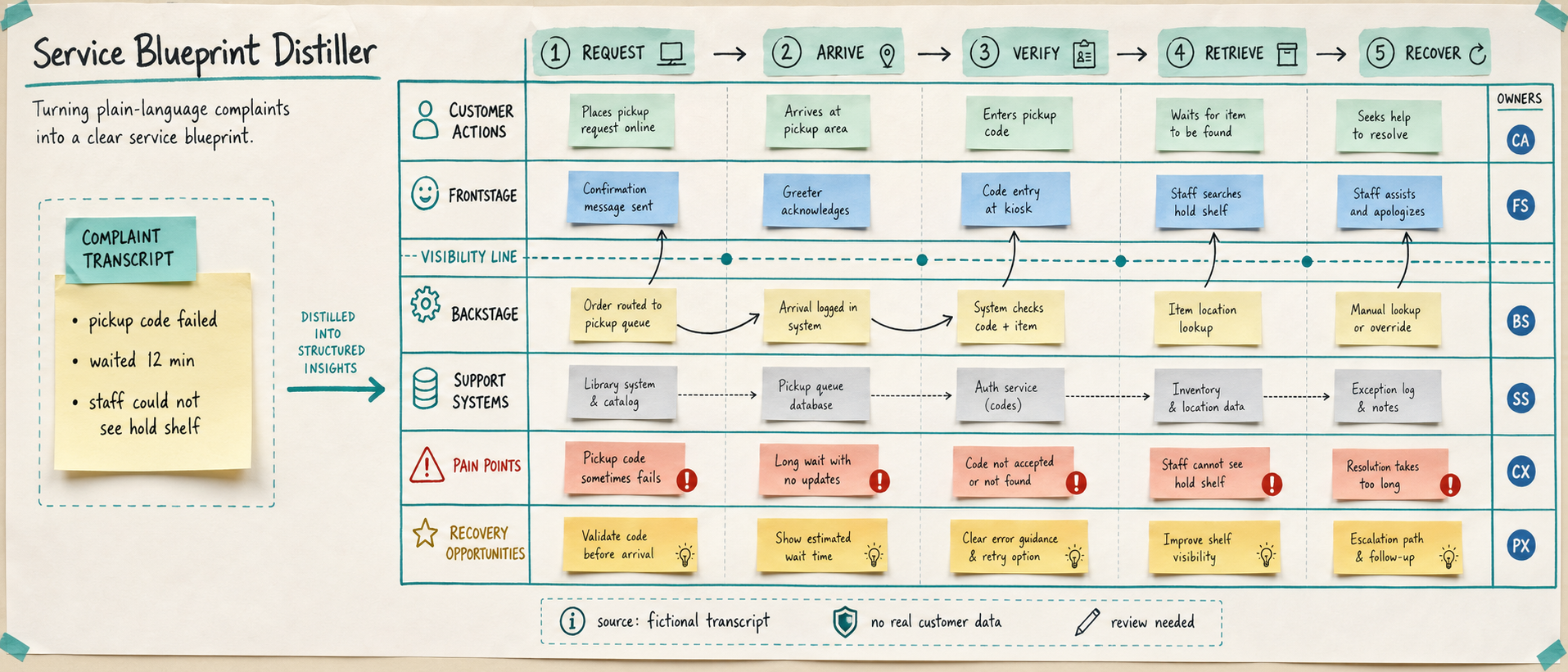 Use case: productivity-visual / service-design workflow Asset type: public gallery image for GPT Image 2 use-case research, ultra-wide 21:9 workshop artifact Primary request: Create a polished fictional service-design canvas titled "Service Blueprint Distiller" showing how GPT Image 2 converts one messy plain-language complaint transcript into a scan-friendly multilane service blueprint. Scene/backdrop: a clean workshop wall canvas, photographed straight-on, with crisp paper texture, thin colored tape lines, and neatly arranged sticky-note clusters. No hands, no people, no laptops, no logos. Subject: left side contains a small fictional input note labeled "Complaint transcript" with short safe text fragments only: "pickup code failed", "waited 12 min", "staff could not see hold shelf". The large center/right canvas turns it into five horizontal lanes: "Customer actions", "Frontstage", "Visibility line", "Backstage", "Support systems". Use simple icons, arrows, stage chips, pain markers, owner dots, and a final row called "Recovery opportunities". Include a tiny confidence/provenance strip at bottom: "source: fictional transcript", "no real customer data", "review needed". Visual mechanism: make the transformation visible: a thin flow from unstructured text to stages, then into aligned touchpoints, hidden dependencies, and fixes. Emphasize the visibility line separating customer-visible and internal work. Style/medium: high-end service design workshop board, editorial UX research artifact, clear information hierarchy, legible but not overloaded, professional and realistic. Composition/framing: ultra-wide panoramic canvas, not a 2x2 or 2x3 grid, not a dashboard, not a tabletop game, not a physical instrument. Use lanes spanning horizontally with a few vertical stage columns: "Request", "Arrive", "Verify", "Retrieve", "Recover". Color palette: warm white paper, graphite ink, teal lane dividers, coral pain markers, mustard opportunity tags, muted blue owner dots. Avoid purple-dominant palettes. Text requirements: Only the title and lane/stage labels above, plus short fictional fragments. Keep text clean and mostly readable; do not invent real brands. Safety and rights constraints: completely fictional service called Mossline Library Pickup; no real brands, logos, institutions, customer names, phone numbers, addresses, QR codes, barcodes, public figures, politics, medical/legal/financial services, harmful instructions, adult content, gore, weapons, copyrighted characters, celebrity likeness, living-artist style imitation, watermark, copied template, copied source image, or external prompt text.