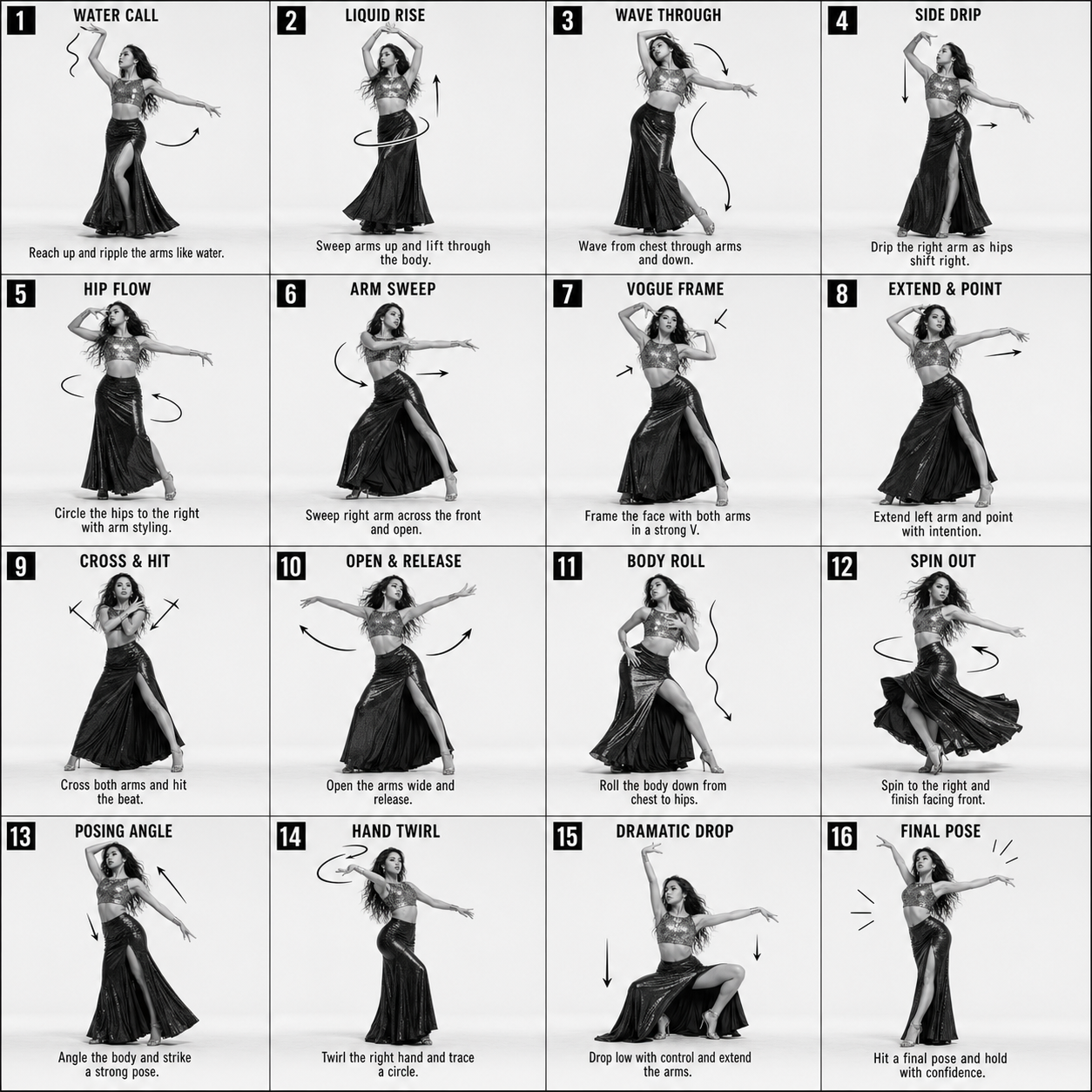 Prompt: Create a clean, black-and-white instructional poster showing a 16-step dance sequence performed by a single female dancer.