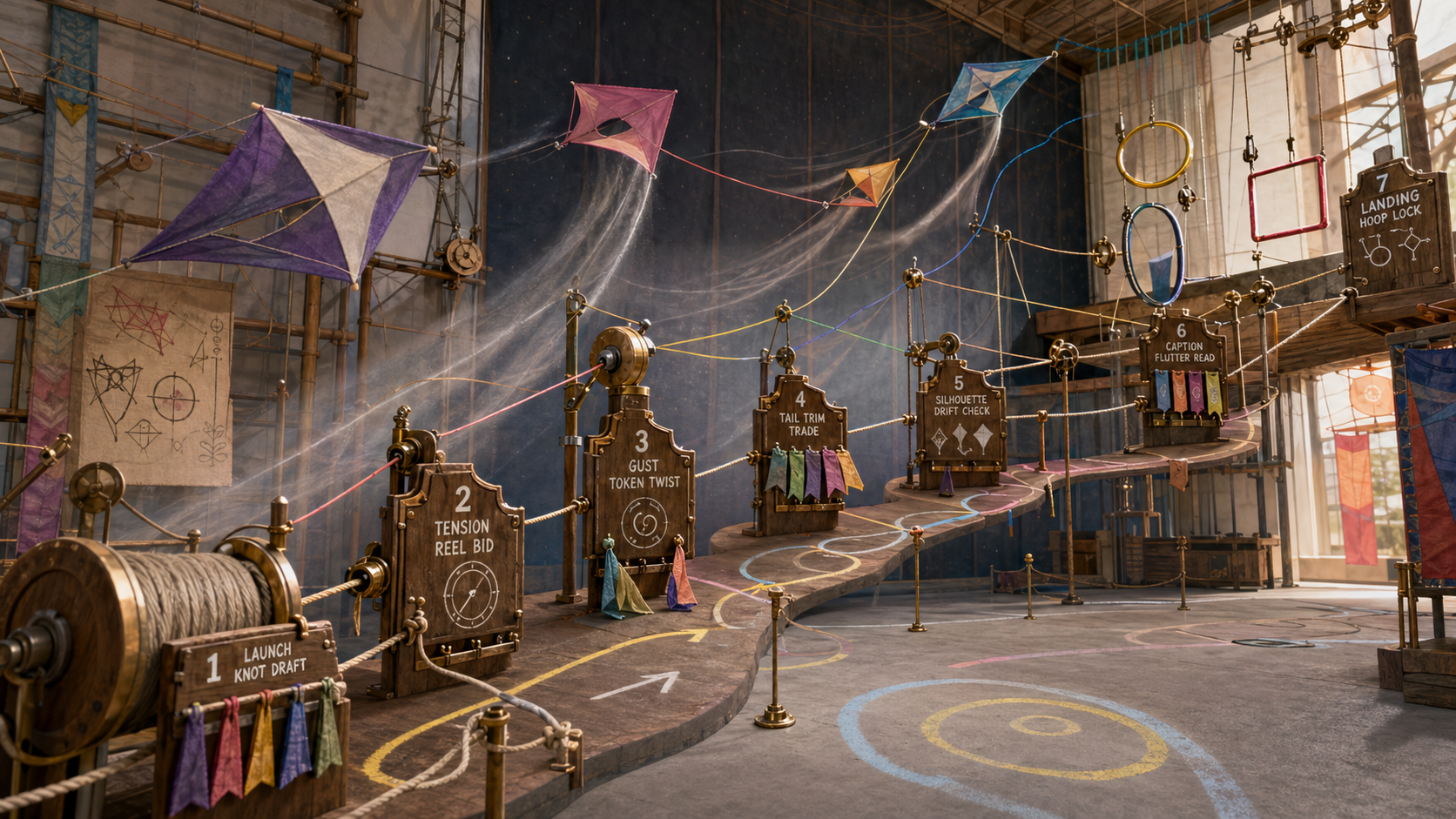 Use case: stylized-concept / derived play mechanic: kite-wind-route-league Asset type: public-gallery derived-play concept image, 16:9 landscape Primary request: Derive a playable "Kite Line League" from the Prompt Kite Wind Tunnel use-case: a kinetic floor-to-ceiling route game where players tune prompt tension, airflow, and landing format through line reels and cloth markers. Make it clearly different from a 2x3 research board, card spread, tabletop board, hotel cabinet, greenhouse, chef counter, patchbay, lantern, seismograph, mosaic, or film stage. Scene/backdrop: an open fictional training hall with a tall vertical wind wall, pulley reels mounted around the room, colored string routes crossing through harmless airflow lanes, fabric kites as abstract geometric craft objects, and landing hoops suspended at different aspect ratios. Subject/game rules: show seven original play stations as physical mechanisms along one continuous route: launch knot draft, tension reel bid, gust token twist, tail trim trade, silhouette drift checkpoint, caption flutter read, landing hoop lock. Each station should look like a playable rule in a family-safe kinetic game, using ropes, pulleys, ribbons, rings, chalk score arcs, and fabric tabs. Composition/framing: cinematic wide angle, one continuous looping route from lower left launch spool to upper right landing hoops; no panel grid; no cards; no UI screen. Use sparse fictional labels only; avoid dense readable text. Style/medium: whimsical precision craft photography meets polished 3D editorial illustration; cotton string, bamboo, brass pulleys, vellum fabric, chalk, transparent airflow, warm daylight, crisp material detail. Mechanic focus: the derived play should test prompt balance, reference pull, style drift recovery, silhouette stability, short-label readability, and output-format landing through physical route choices. Safety and rights constraints: all objects, labels, institutions, data, and characters are fictional. Do not include people, animals, mascots, real brands, trademarks, celebrities, copyrighted characters, living-artist style imitation, political persuasion, parties, elections, public political figures, sexual content, nudity, harmful instructions, weapons, or graphic violence. Output constraints: landscape image, high detail, no watermark, no logo, no QR code, no real product names.