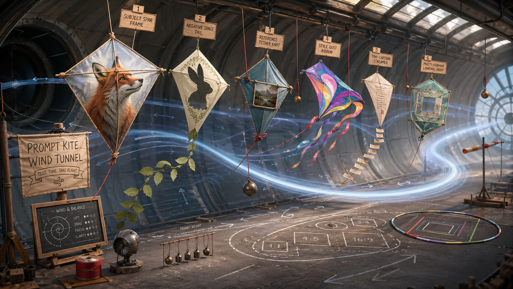 Use case: infographic-diagram / original GPT Image 2 use-case concept Asset type: public-gallery concept image, 16:9 landscape Primary request: Create a single continuous "Prompt Kite Wind Tunnel" scene that visualizes fresh GPT Image 2 use cases as wind-tested kites, not as a grid, not as a dashboard, not as a tabletop board. Scene/backdrop: a bright fictional indoor wind tunnel shaped like a long curved hangar, with transparent airflow ribbons, hanging calibration weights, chalk marks on the floor, and six different handmade kites suspended along one sweeping S-shaped flight path. Subject: each kite demonstrates a different image-generation play mechanic: subject spar frame, negative-space tail, reference tether knot, style gust ribbon, tiny-caption streamer, multi-format landing hoop. The mechanics should be communicated through physical kite parts, line tension, airflow traces, and landing targets rather than literal UI panels. Composition/framing: one panoramic continuous scene from left foreground to right background; the viewer follows the S-shaped kite path through the hangar. Use small fictional labels only where useful; avoid dense readable text. No 2x3 panel layout. Style/medium: polished editorial 3D illustration with tactile craft materials, vellum, bamboo spars, thread, translucent fabric, chalk dust, and soft studio light. Interaction idea: the image should imply that GPT Image 2 can test prompt balance, reference pull, style drift, legibility in motion, and aspect-ratio landing accuracy through a playful wind-tunnel artifact. Safety and rights constraints: all objects, labels, institutions, data, and characters are fictional. No real brands, trademarks, celebrities, copyrighted characters, living-artist style imitation, political persuasion, parties, elections, public political figures, sexual content, nudity, harmful instructions, weapons, or graphic violence. Output constraints: landscape image, high detail, no watermark, no logo, no QR code, no real product names.