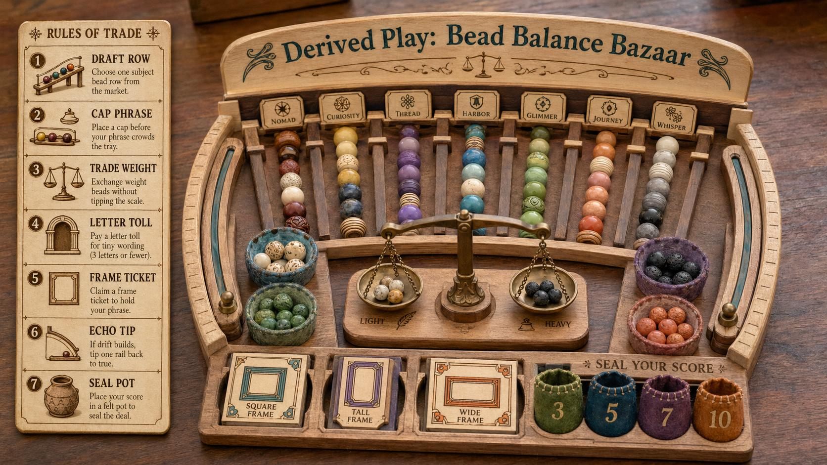 Visible title: "Derived Play: Bead Balance Bazaar". Create a compact handcrafted tabletop skill game photographed from a low oblique angle, 16:9. It is a semicircular bead market tray with tilting rails, bead bowls, tiny balance scales, felt score cups, and removable square/tall/wide frame tickets. Seven etched rules are visible: Draft Row, Cap Phrase, Trade Weight, Letter Toll, Frame Ticket, Echo Tip, Seal Pot. Play: draft one subject bead row, cap a phrase before it crowds the tray, trade weight beads without tipping the scale, pay a letter toll for tiny wording, pick a frame ticket, correct drift by tipping one rail back, then seal the score pot. No hands or people. It should feel like a new bead economy game, not a normal abacus diagram and not any previous gallery apparatus such as grids, cards, routes, chips, mazes, stages, gardens, kitchens, paper rolls, trays, presses, looms, weather devices, pinball, or kite lines. All content is fictional and rights-safe; avoid unsafe, adult, graphic, political, branded, celebrity, or copyrighted material. No watermark or QR code.