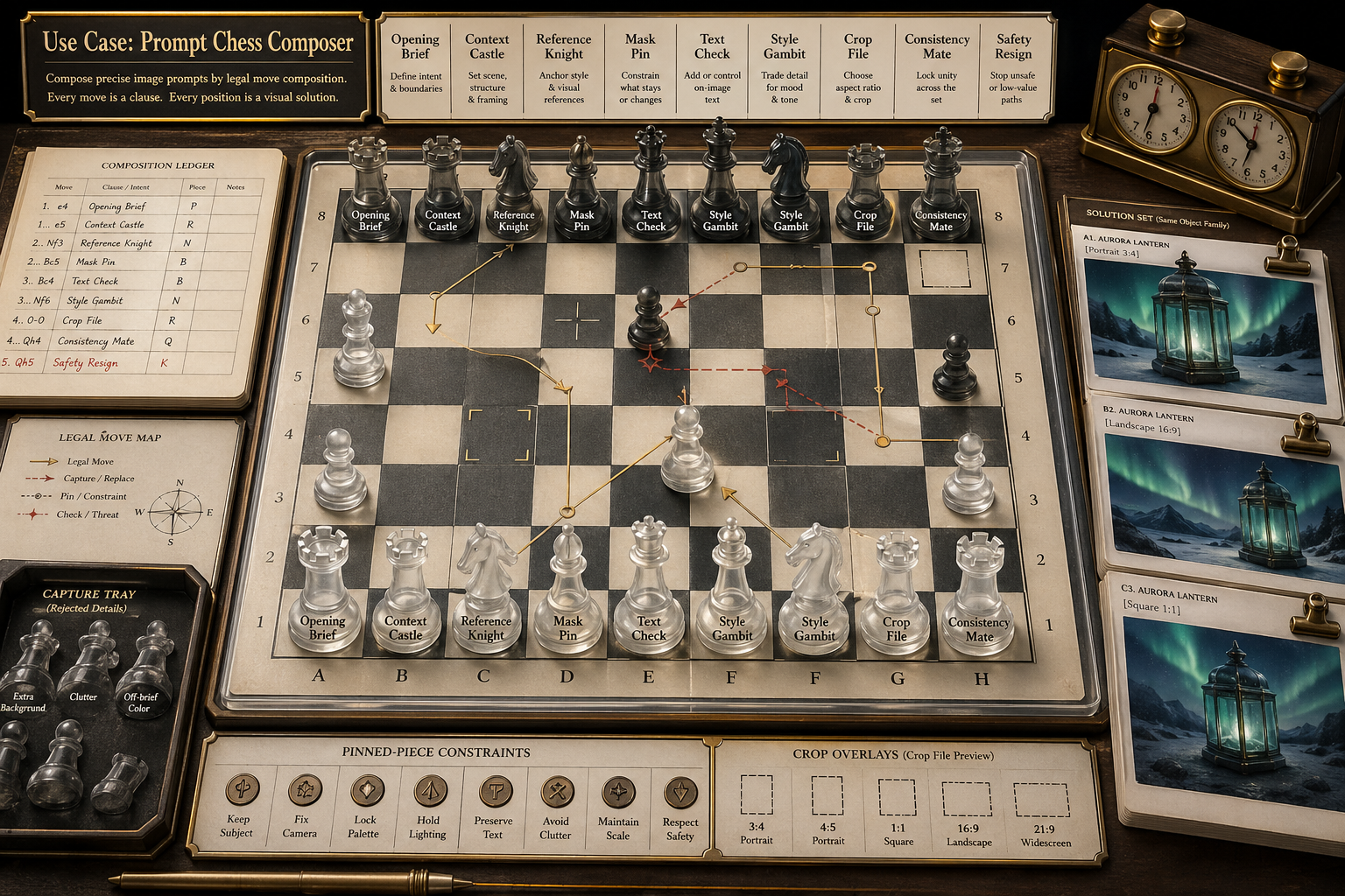 Create a single polished gallery image for a new GPT Image 2 use case titled Use Case: Prompt Chess Composer. Show a fictional visual prompt-composition desk built around one large elegant chessboard, not a contact sheet: translucent chess pieces engraved with prompt clauses, an annotated move ledger, a small chess clock, pinned-piece constraint markers, legal-move arrows, crop-square overlays, capture trays for rejected details, and three miniature fictional image-solution cards clipped beside the board. The mechanism is image prompting by legal move composition: readable labels should include Opening Brief, Context Castle, Reference Knight, Mask Pin, Text Check, Style Gambit, Crop File, Consistency Mate, and Safety Resign. Each image-solution card shows the same invented object family solved from a different board position, with readable fictional labels and no real brands, no real people, no copyrighted characters. Output format should feel like a premium macro photograph of a chess-problem composer workstation mixed with precise technical annotation, ivory and charcoal board, glass overlays, brass arrows, crisp engraved labels, clean shadows, no hands, no logos, no political content, no dangerous instructions, no gore, no sexual content, no living artist style imitation.