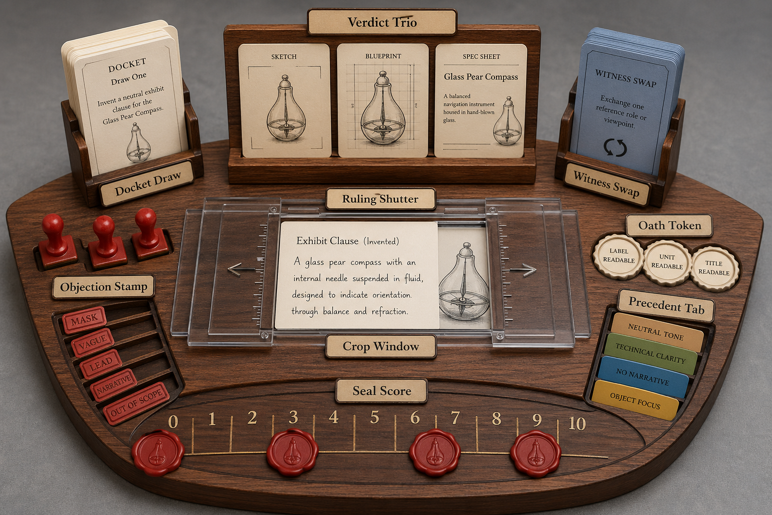 Create a single polished gallery image for a derived play concept titled Derived Play: Objection Draft. It should be a different artifact from the evidence theater: show a compact tabletop drafting game shaped like a semicircular hearing bench, not a board grid and not a contact sheet. Components include docket draw cards, reference-witness swap cards, small red objection stamps, sliding crop-ruling shutters, caption oath tokens, style precedent tabs, a verdict trio display stand, and a seal-score track with wax-like tokens. The gameplay mechanism is adversarial prompt review without any real legal case: players draw one docket card, submit one fictional exhibit clause for the invented glass pear compass, another player may stamp one mask objection, the ruling shutter hides or reveals a crop, oath tokens score only readable labels, precedent tabs limit style drift, and the verdict trio scores only if three result cards preserve the same invented object across three formats. Readable labels should include Docket Draw, Witness Swap, Objection Stamp, Ruling Shutter, Oath Token, Precedent Tab, Verdict Trio, and Seal Score. Output format: crisp product photo of a harmless fictional tabletop drafting game, semicircular walnut bench, acrylic shutters, paper cards, wax-like score tokens, no people, no hands, no logos, no real brands, no public figures, no copyrighted characters, no political content, no dangerous instructions, no gore, no sexual content, no living artist style imitation.