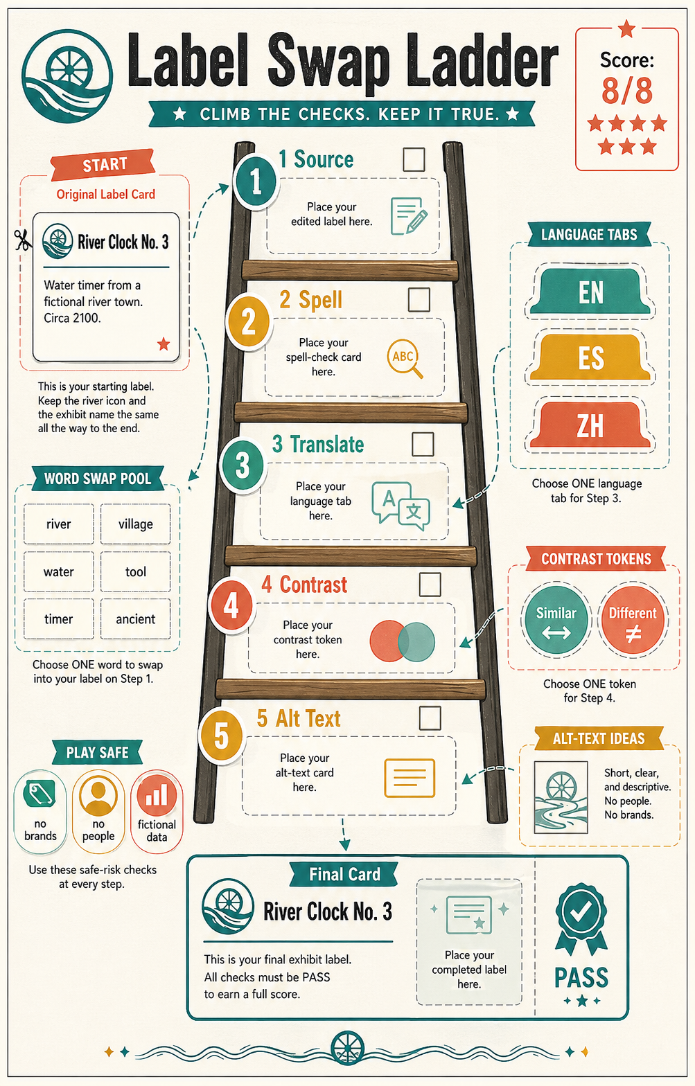 Create one polished public-gallery image titled exactly "Derived Play: Label Swap Ladder". This is derived from the Label Repair Console, but it becomes a different classroom/education gameplay artifact, not a software dashboard and not a physical prompt-control machine. Output format: one vertical 4:5 printable classroom activity sheet / board-game worksheet, cleanly designed as a flat educational poster. It is not a macro product photo, not a tray, not a lab instrument, not a 2x3 research board, and not a contact sheet. Scene: a fictional museum-education worksheet where players repair short exhibit labels by climbing a ladder of checks. The worksheet has a central ladder path with five rungs, small detachable-looking card zones, and a final wall-label preview at the bottom. Use a friendly but professional museum education style for adults and teens, with no people shown. Exact short readable text to render: "Label Swap Ladder", "1 Source", "2 Spell", "3 Translate", "4 Contrast", "5 Alt Text", "Final Card", "River Clock No. 3", "EN / ES / ZH", "PASS", "Score: 8/8". Keep text concise and legible; do not add long paragraphs or random text. Gameplay mechanism shown through layout: players start with a small fictional label card for "River Clock No. 3", swap one word card, choose a language tab, place a contrast token, write a short alt-text card, then reach Final Card only if the blue-green river icon and the exhibit name stay consistent. Include small checkboxes, numbered rungs, a simple score meter, and three safe-risk reminder chips: "no brands", "no people", "fictional data". Visual style: museum education worksheet, warm white paper, charcoal typography, teal, amber, and coral accents, crisp vector-like shapes, accessible contrast, neat printable margins, tactile but flat design. Distinct from a UI screenshot: it should feel like a downloadable activity handout plus small board-game rules embedded in the graphic. Safety and rights: fictional museum activity, fictional exhibit and data, no real museum names, no real brands or trademarks, no public figures, no politics, no harmful instructions, no adult or explicit content, no gore or violence, no copyrighted characters, no living-artist style imitation, no watermark.