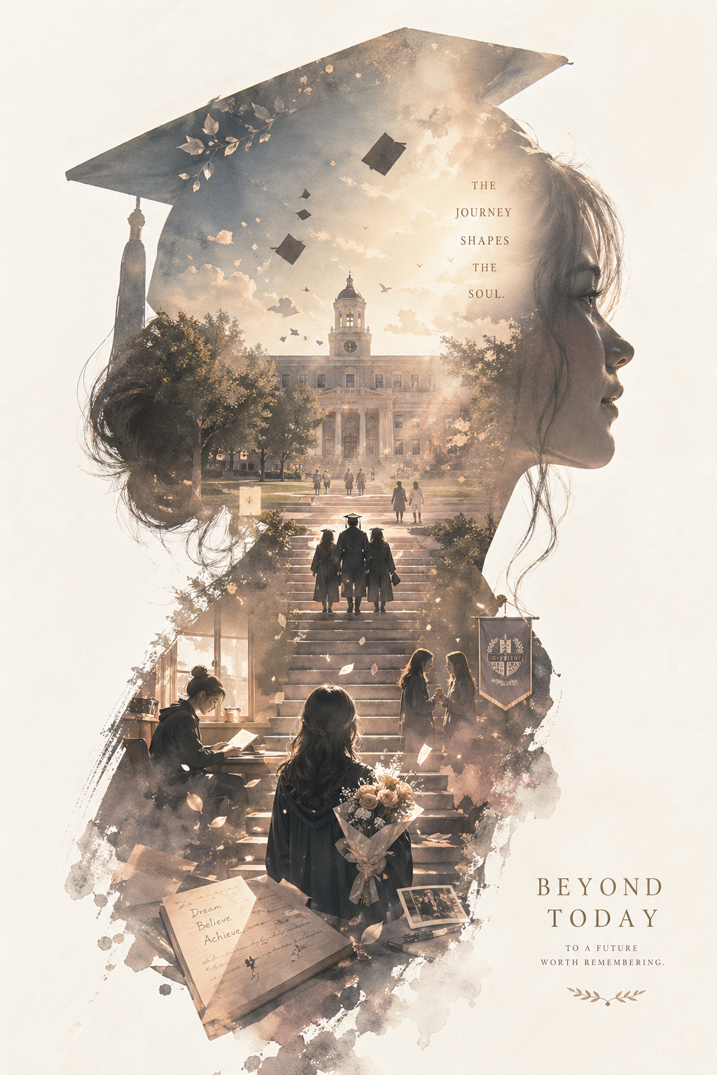 根据热门 X 提示词做最小兼容改写,生成一张收藏版史诗叙事毕业海报。巨大的年轻毕业生女性侧脸剪影作为外轮廓,剪影内部生长出完整世界观与标志性校园毕业场景:教学楼、礼堂、学位帽、花束、阶梯、同学关系、象征符号、关键建筑、纸张、光影与纪念氛围。整体不是普通拼贴,而是高级的剪影轮廓填充式叙事合成,带有双重曝光联想,但更偏电影海报与梦幻水彩插画融合风格。柔和空气透视,轻雾化过渡,纸张颗粒,边缘留白与刷痕,大面积留白,版式克制高级,安静、宏大、神圣、怀旧、诗意、传说感。风格、色彩、场景、材质全部围绕校园毕业主题自动适配,所有元素必须强绑定主题,一眼识别,不要杂乱,不要硬拼贴,不要模板化背景,不要廉价奇幻素材。如出现字体,仅使用英文。No watermark.